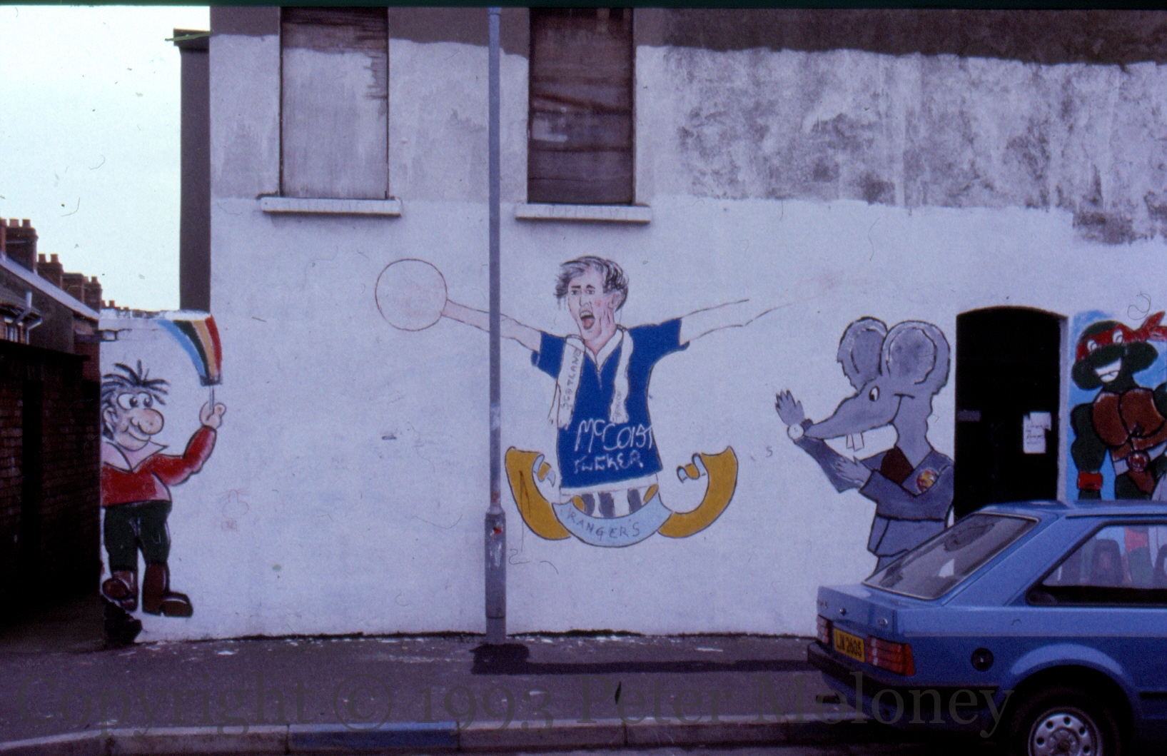 “PSNI out”, “CRF” (Catholic Reaction Force) “RIRA” and “BRY” (Bogside Republican Youth) graffiti in (the old) Dove Gardens, Derry. A Celtic player (Henrik Larsson?) completes the scene.