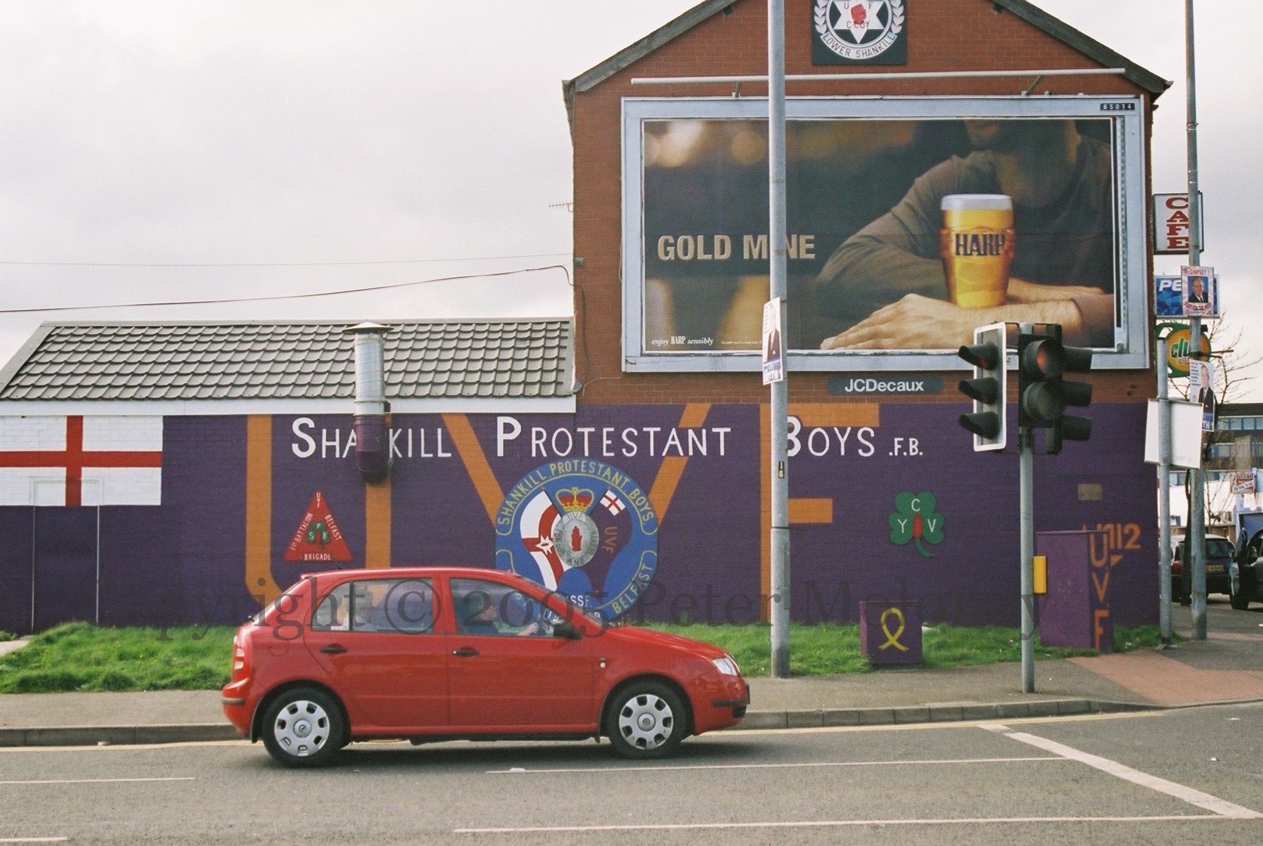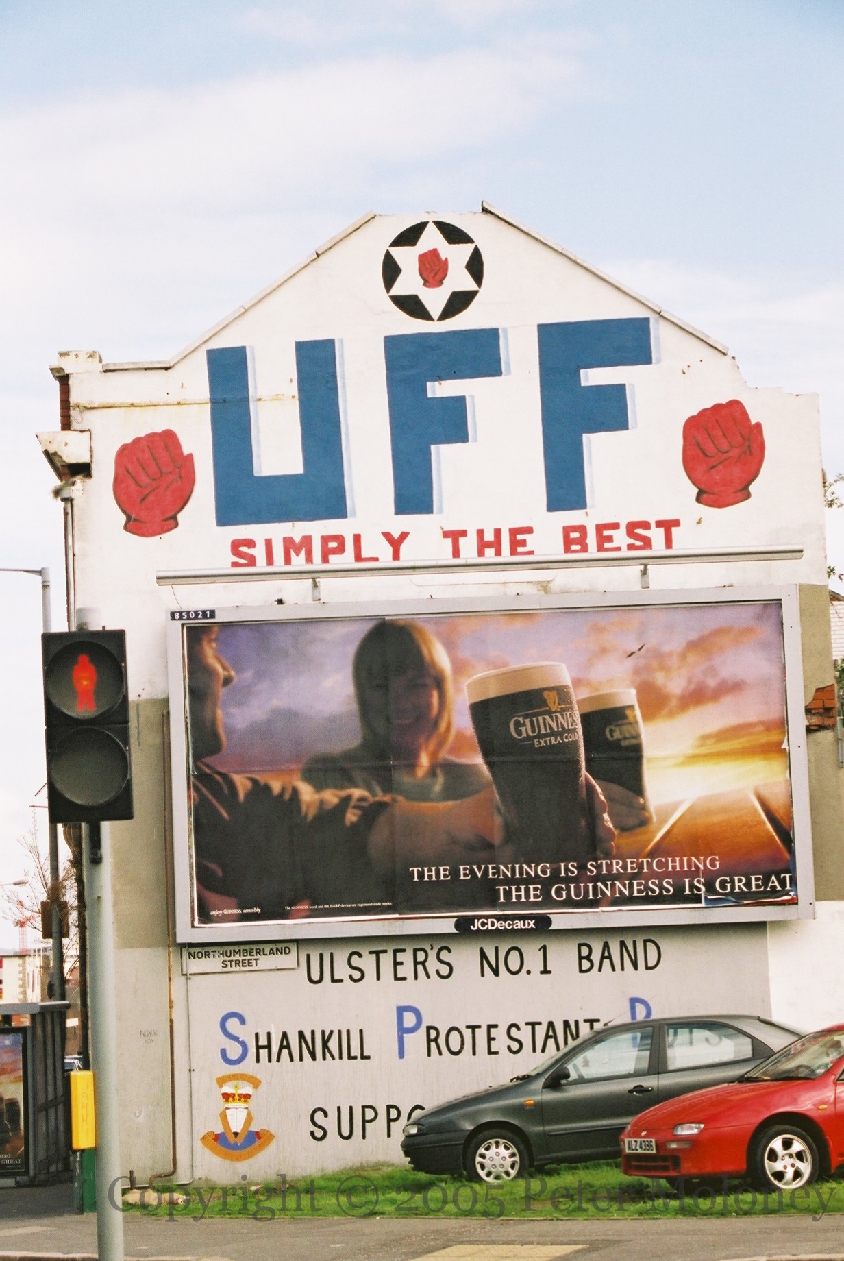 UDA and UVF murals on opposite corners of Northumberland St at the Shankill Road but with the same flute band – the Shankill Protestant Boys USSF (Fb | tw). “Ulster’s No 1 band, Shankill Protestant Boys, supports Drumcree.” The UVF side would outlast the UDA side, though the UFF board up above the Harp ad would remain until 2014 when the corner was redeveloped (into Conor’s Corner).