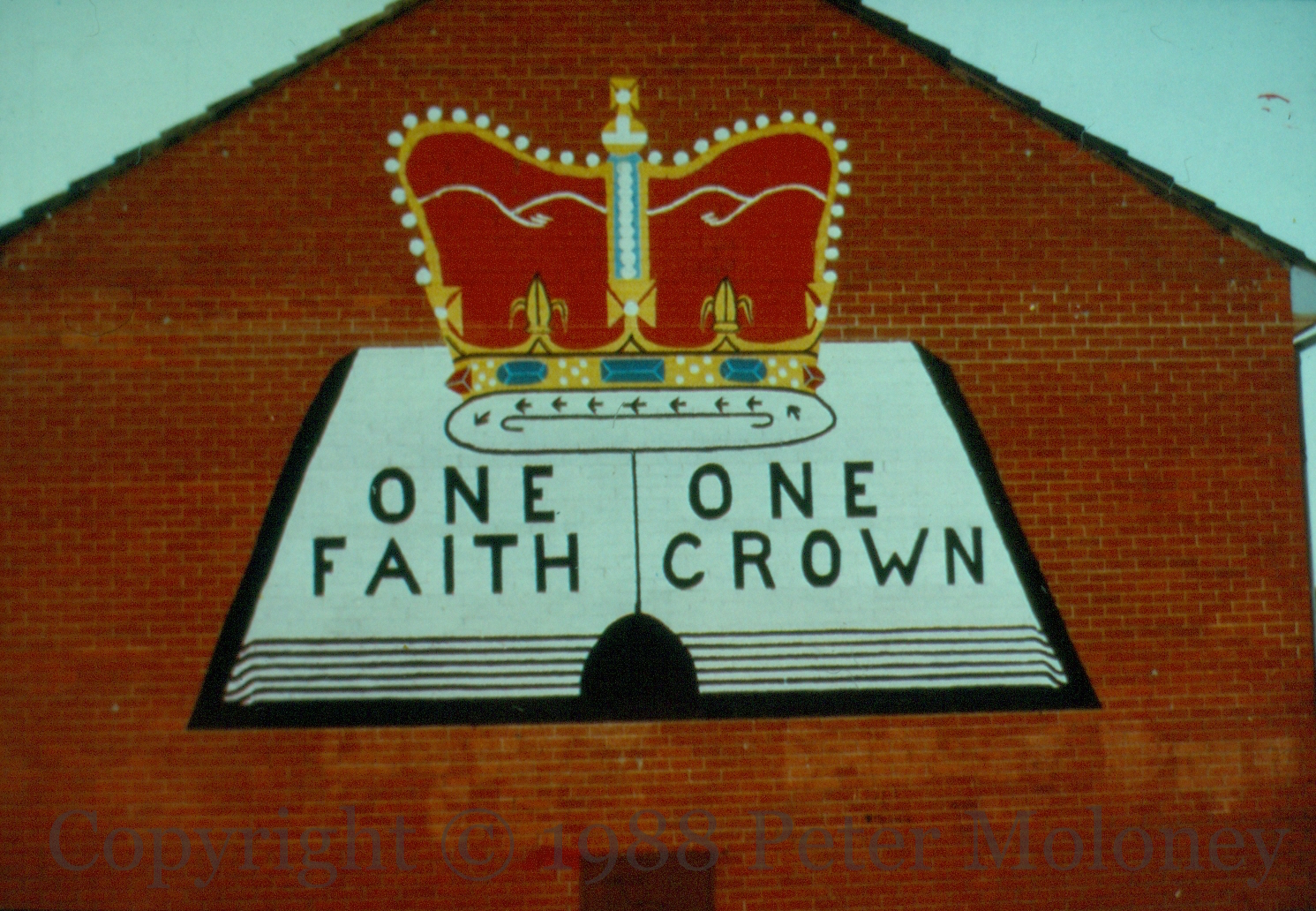 “Dan Winter’s cottage, Co Armagh. Dan Winter was one of the founders of the Orange Order.” “For many, perhaps even most, Orangemen the Order is primarily a religious organisation. As as organisation it is not anti-Roman Catholic; it is a Protestant organisation. The Orange Hall, the meeting place for Orangemen has long occupied a central place in the social life of the community. They serve as venues for a much wider range of gatherings than those, which are strictly Orange. The Orange Order is also a cultural organisation, transmitting a culture and heritage – whether it is banner painting, sustaining a great musical tradition or teachings its ritual – from one generation to the next. It also remains the most cohesive force in Ulster Protestant society and the essential expression of the culture and heritage of the Ulster Protestant people.” Fourth panel on Thorndyke Street, Belfast. With emblem of Pride of the Raven (flute band).