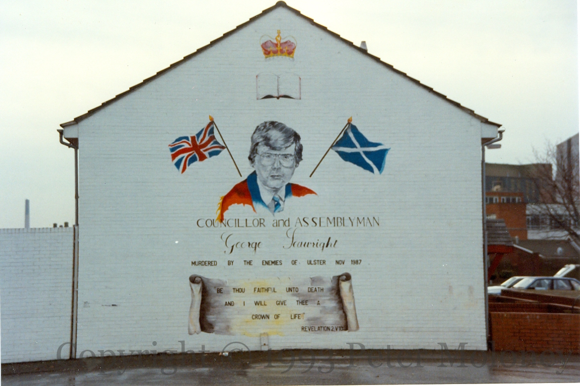 Controversial DUP and later independent politician and preacher George Seawright served as city councillor and NI Assembly member from 1981 to 1986, when he was jailed for his role in physically attacking NI Secretary of State Tom King. He was “murdered by the enemies of Ulster [the IPLO] Nov 1987”. “Be thou faithful unto death and I will give thee a crown of life – Revelation 2 v10.”