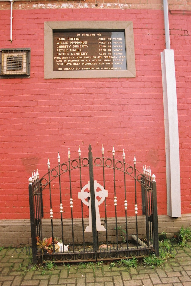 The main plaque (shown first above) is new; like its predecessor (see M02186) list of the local dead of the IRA 1st battalion, Belfast brigade and related members of the republican movement. (A shorter list is on the plaque to the left, shown second.) There is also a 200th anniversary plaque for the 1798 rebellion: “1798-1998 Who Fears To Speak Of 98. This plaque was erected to the memory of the United Irishmen who gave their lives for Irish freedom also those who died as a result of the Great Hunger. ‘These are the times that try mens’ souls.’ [- Thomas Paine] The rich always betray the poor.’ – Henry Joy McCracken.” The memorial garden is next to the Andersonstown Social Club (a.k.a. the PD or “People’s Democracy”).