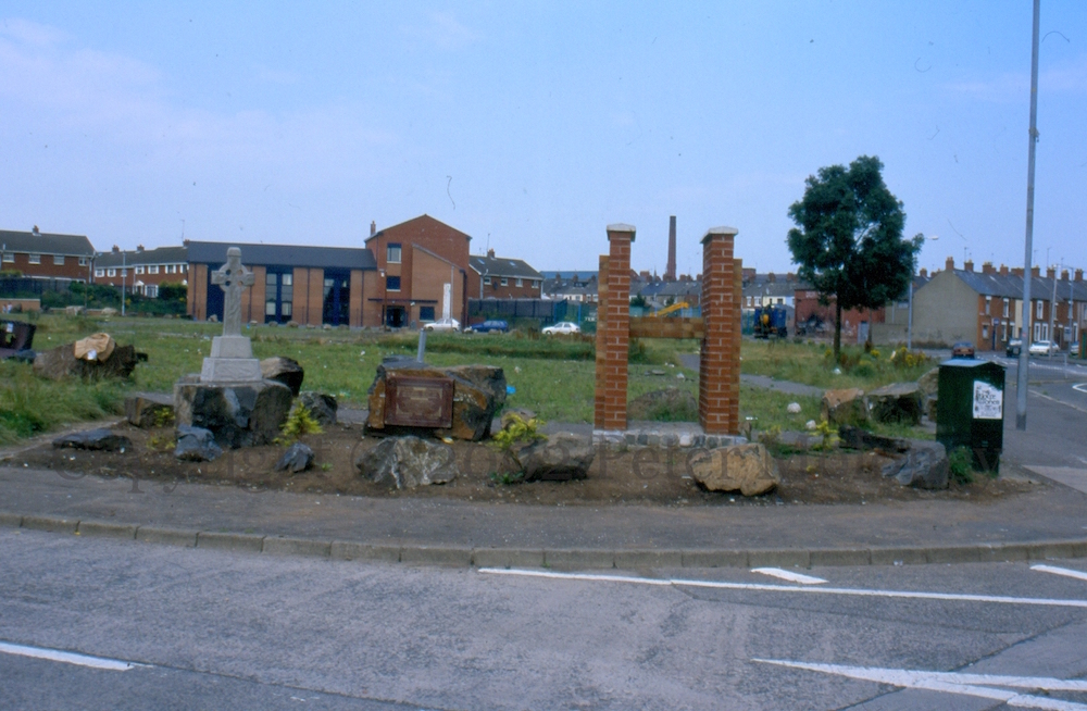“It is not those who can inflict the most but those who can endure the most shall win [who will conquer].” (Terence MacSwiney). Those “from the Ardoyne, Bone, and Ligoniel who died because of Ireland’s troubles” are commemorated on the Celtic cross (which dates back to 1976). The plaque (dating at least to 1993) reads “Oft from prison bars, oft from battle flashes/Oft from heroes’ lip, oftenest from their ashes.” and includes names of deceased IRA and Sınn Féın members killed up to 1972, and civilian locals.