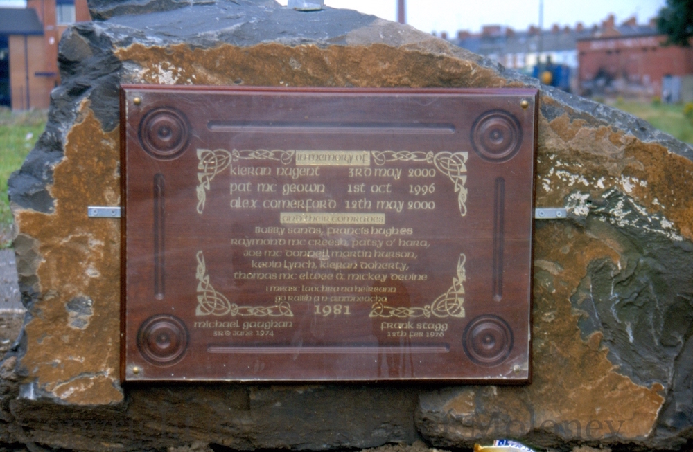 Kieran Nugent, Pat McGeown, and Clonard blanket man Alex Comerford are the lead names on this plaque in Beechmount Grove, joined by the deceased 1981 hunger strikers as well as Gaughan and Stagg.