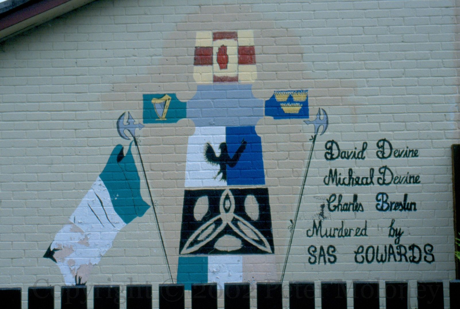 “David Devine, Michael Devine, Charles Breslin – murdered by SAS cowards.” The three IRA members, aged 16, 22, and 20, were shot by SAS soldiers while returning arms to a dump in a field outside Strabane on February 23rd, 1985. The incident prompted accusations of a ‘shoot-to-kill’ policy, as there was no attempt at arrest.