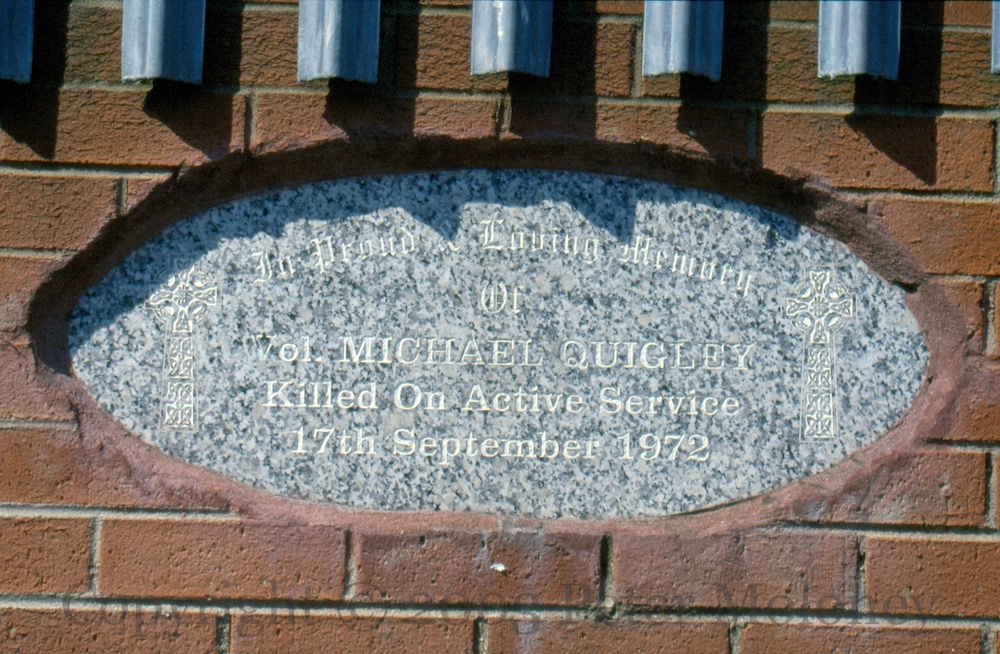 Michael Quigley, IRA, was shot dead at age 19 by the British Army during a riot in Creggan, Derry, in 1972, near the spot of this memorial plaque in Central Drive.