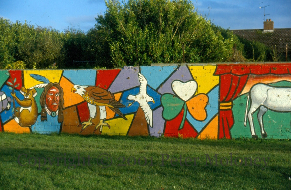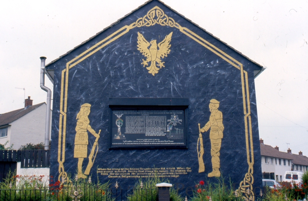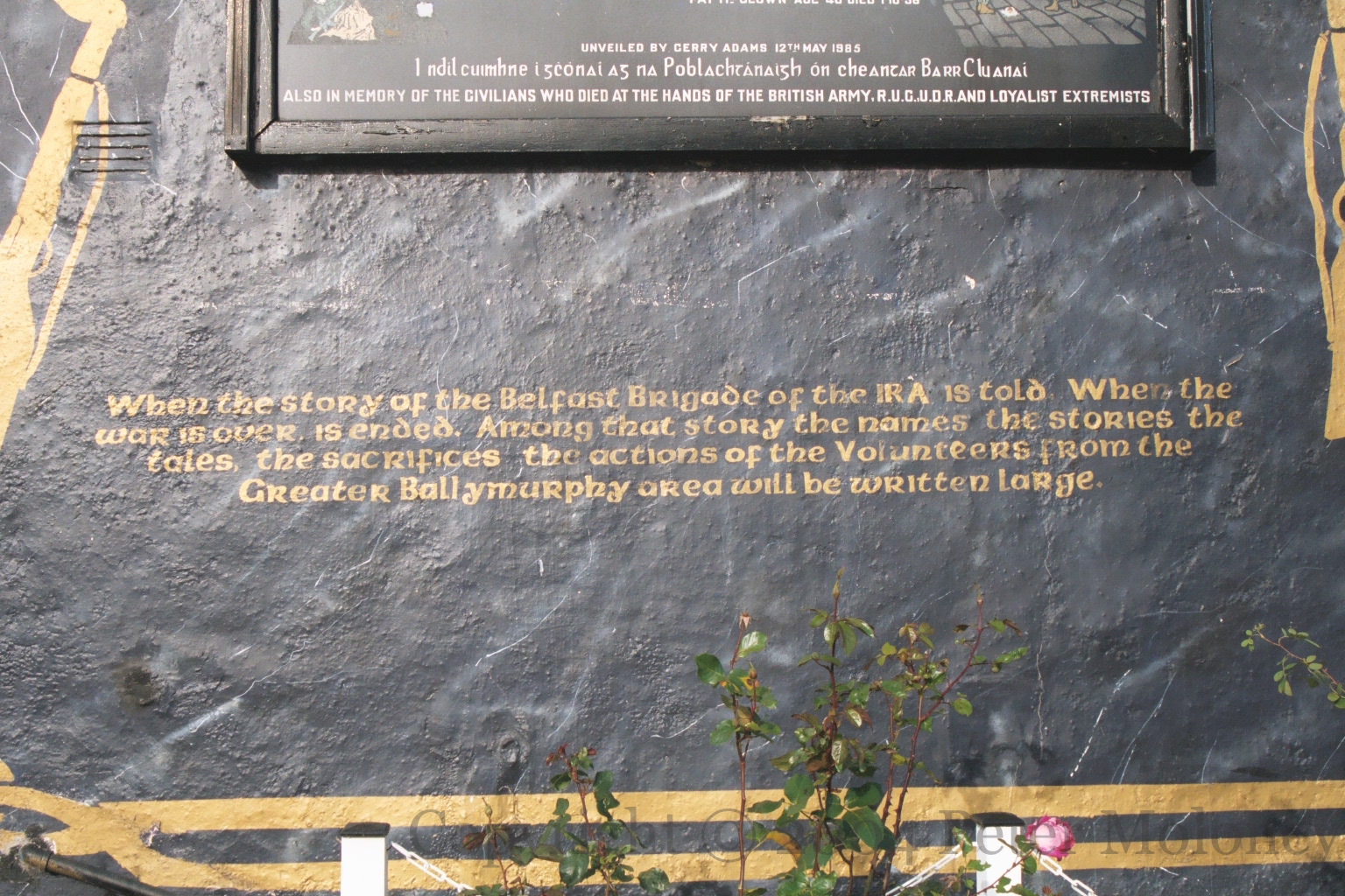 “And all around are monuments that bear a martyr’s name/True patriots who fought and died to kindle freedoms flame/Jimmy Quigley, [Eamonn] McCormick and [Teddy] O’Neill with [Michael] Magee brave/Remember them, they died for us and found a martyr’s grave.” The words of Ray McAreavey’s song are modified to include four Ballymurphy IRA/Fıanna volunteers. With additional portraits of local stalwarts Alice Franklin and Mary Fegan.