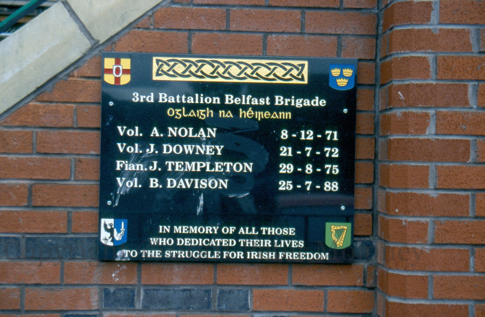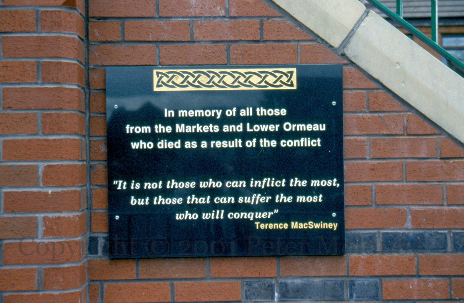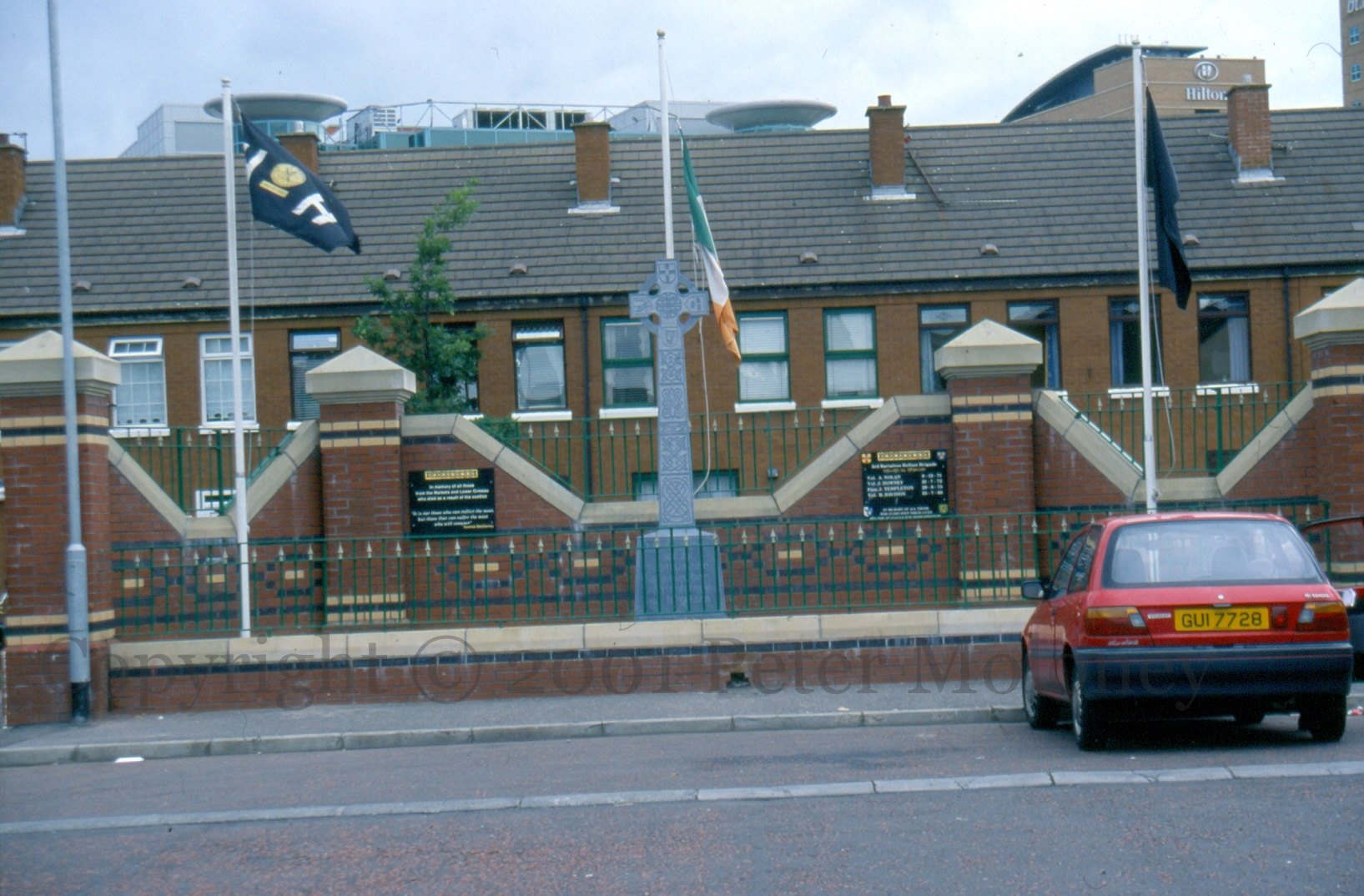 Celtic cross and plaques “In memory of all those from the Markets and Lower Ormeau who died as a result of the conflict” (with Terence MacSwiney quote) and “In memory of all those who dedicated their lives to the struggle for Irish freedom”, in particular IRA 3rd battalion Belfast Brigade volunteers Nolan, Downey, Davison, and Fıan J. Templeton. With flags for the 20th anniversary of the hunger strike.