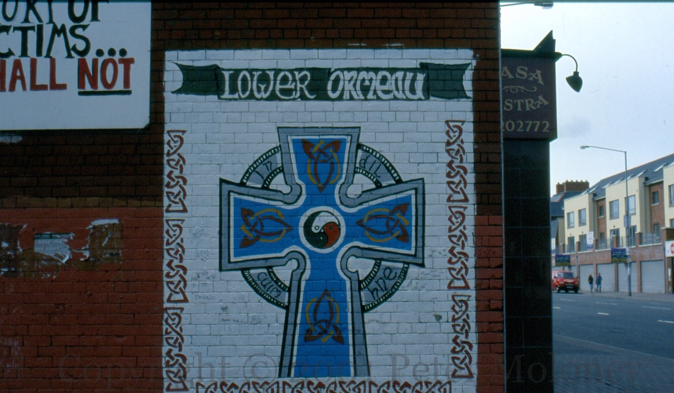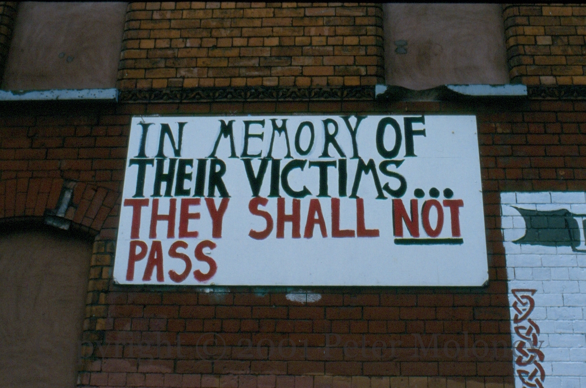 “In memory of their victims … they shall not pass.” An elaborate celtic cross in memory (i ndil cuimhne) of Troubles victims from Catholic south Belfast and a promise to block Orange Order parades in the lower Ormeau.