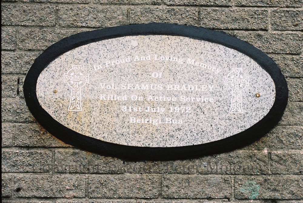 “In proud and loving memory of Vol. Seamus Bradley, killed on active service 31st July 1972. Beırıgí bua.” For (a little) more, see Hegarty And Bradley; for much more, see Volunteer Seamus Bradley.