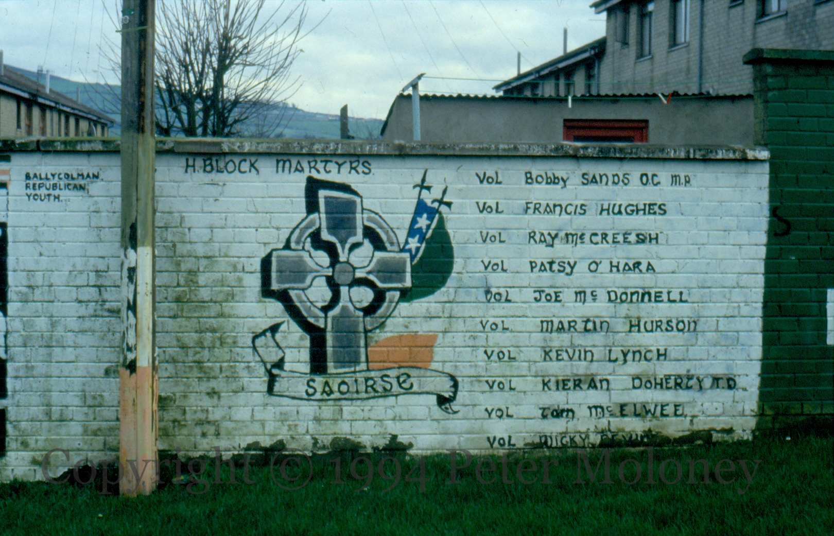 Another 1994 update image of a 1989 Ballycolman/Strabane mural, a roll of honour for the ten deceased 1981 hunger strikers next to a celtic cross with Starry Plough and Tricolour on pikes. “Saoirse.”