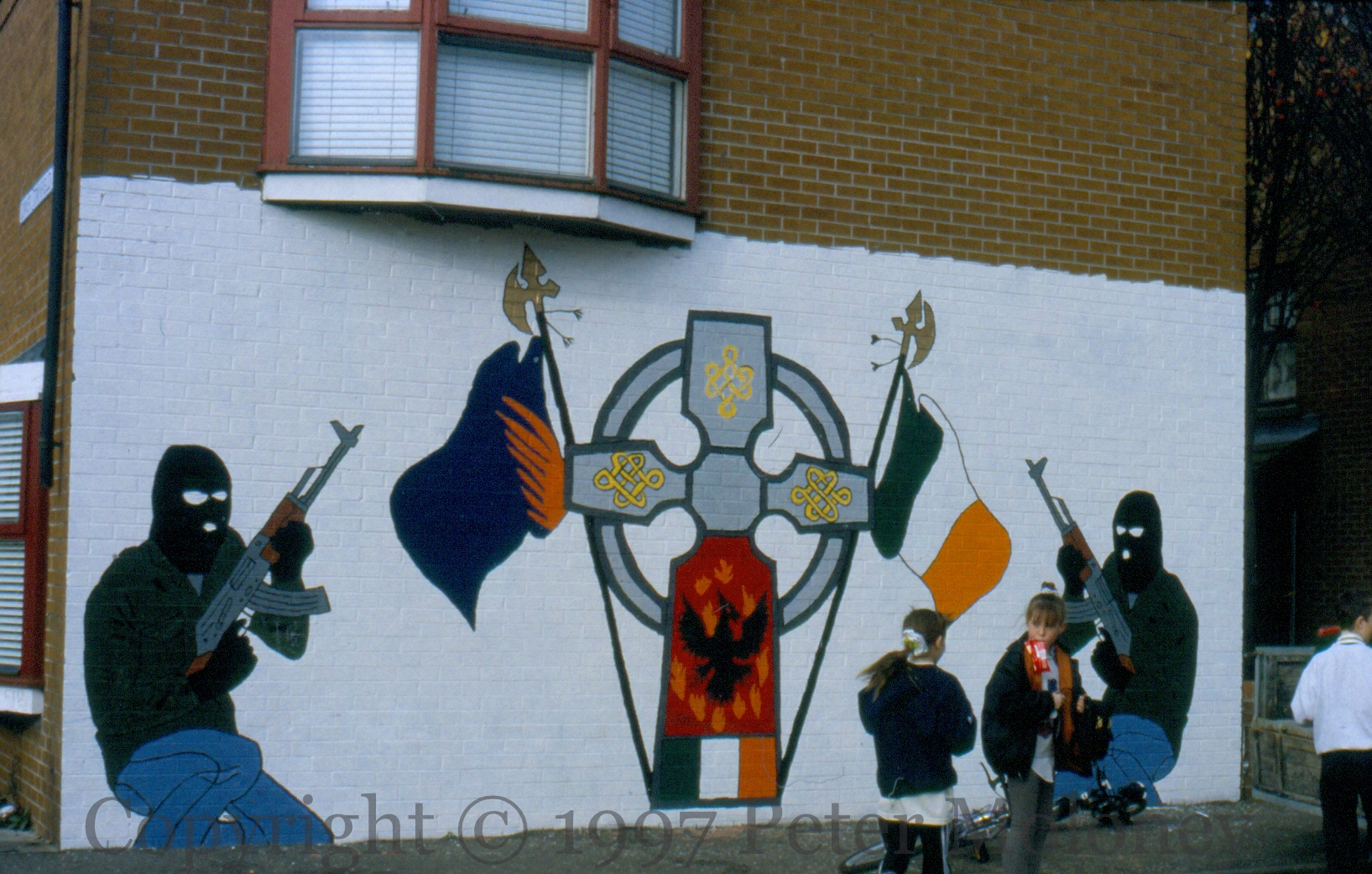 A mural of traditional republican symbols – armed and masked volunteers with celtic cross, phoenix, pikes, Tricolour and Sunburst flags – but unusual for 1997. Perhaps it dates to the period before the second/renewed ceasefire, on July 19th. Stanfield Place, Belfast. M01346