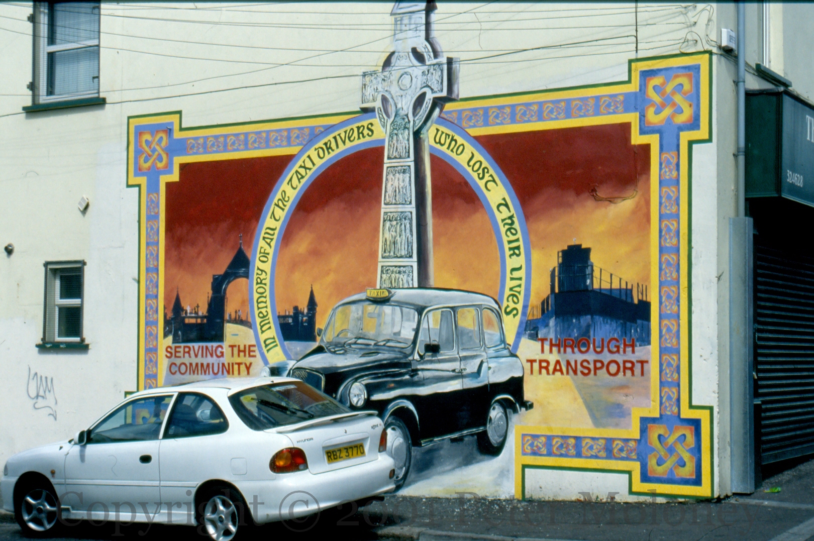 “In memory of the taxi drivers who lost their lives.” The gates of Milltown cemetery and the Andersonstown RUC base flank a black taxi beneath a celtic cross. Shiels Street, Belfast.