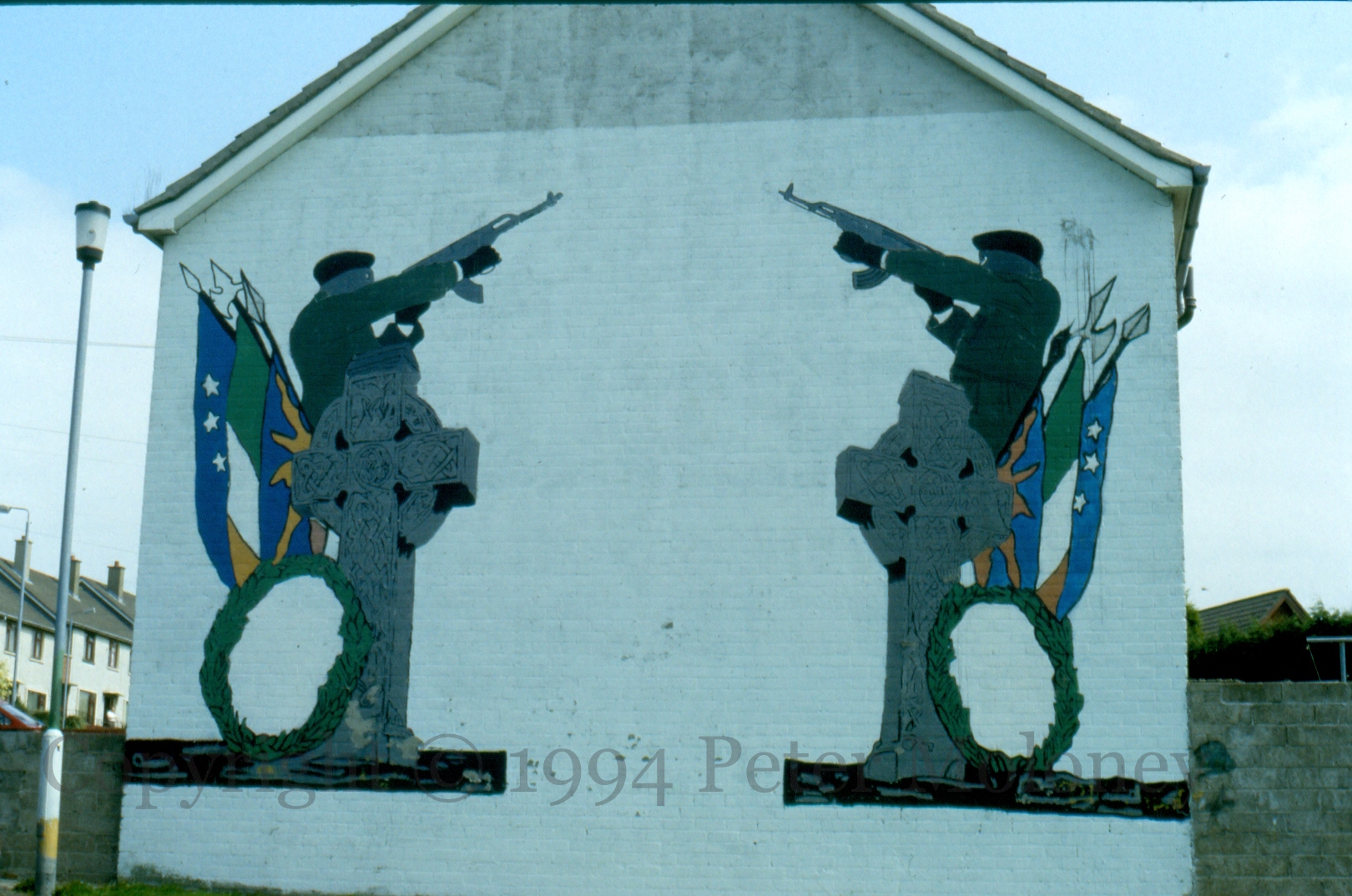 Another 1994 update image of a 1989 Ballycolman/Strabane mural, a roll of honour for the ten deceased 1981 hunger strikers next to a celtic cross with Starry Plough and Tricolour on pikes. “Saoirse.”