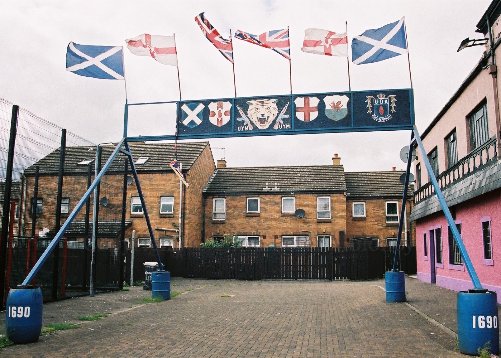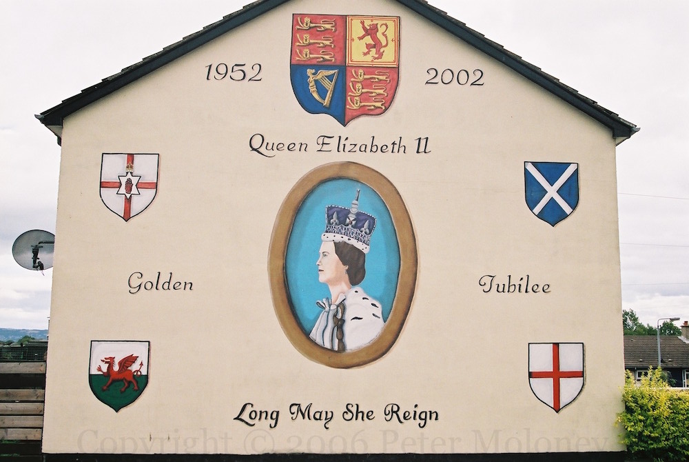 Elizabeth Alexandra Mary Windsor acceded to the throne of the United Kingdom in 1952 (she was crowned in 1953). 2002 was her golden jubilee year. See also Long To Reign Over Us and HM Queen Elizabeth II (which also has UDA sponsorship) and Long May She Reign.