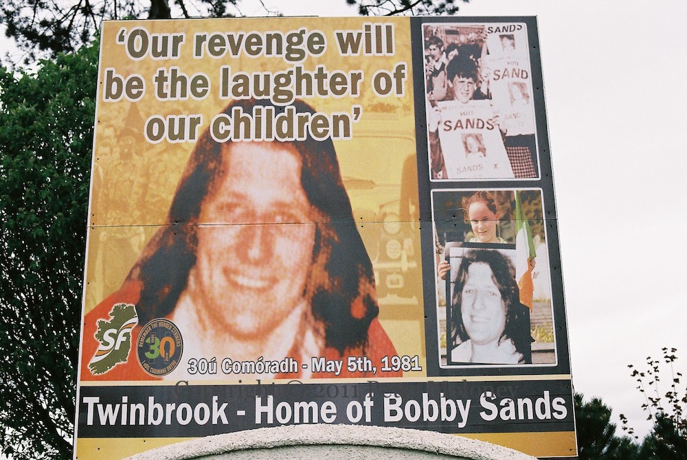 “Our revenge will be the laughter of our children.” For the thirtieth anniversary (30ú comóradh) of his death on May 5th, 1981, a board in Twinbrook remembering IRA volunteer, hunger striker, and MP, Bobby Sands.