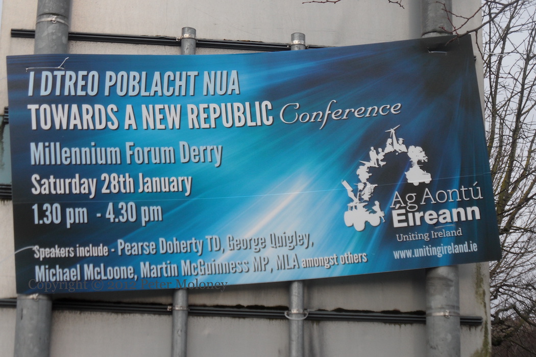 “I dtreo poblacht nua – towards a new republic – conference. Millennium Forum Derry. Speakers include Pearse Doherty TD, George Quigley, Michael McLoone, Martin McGuinness, MLA amongst others. Ag aontú Éıreann – uniting Ireland.” The conference was organised by Sınn Féın. Basil McCrea of the UUP also spoke (Jude Collins).