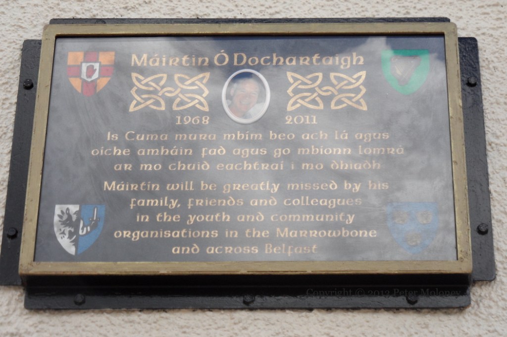“Máırtın Ó Dochartaıgh 1968-2011. Is cuma mura mbím beo ach lá agus oíche amháın fad agus go mbíonn lomrá [ıomrá] ar mo chuıd eachtraí ı mo dhıadh. [It is of no matter whether I live only a single day and night so long as my endeavours gain repute after I am gone.] Máırtín will be greatly missed by his family, friends and colleagues in the youth and community organisations in the Marrowbone and across Belfast.”