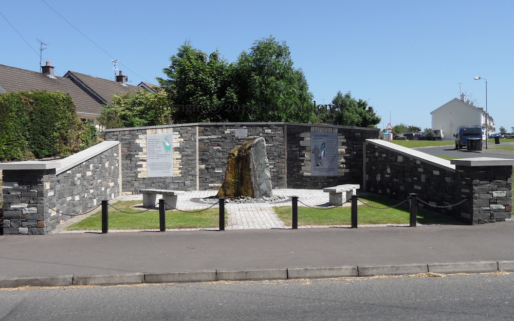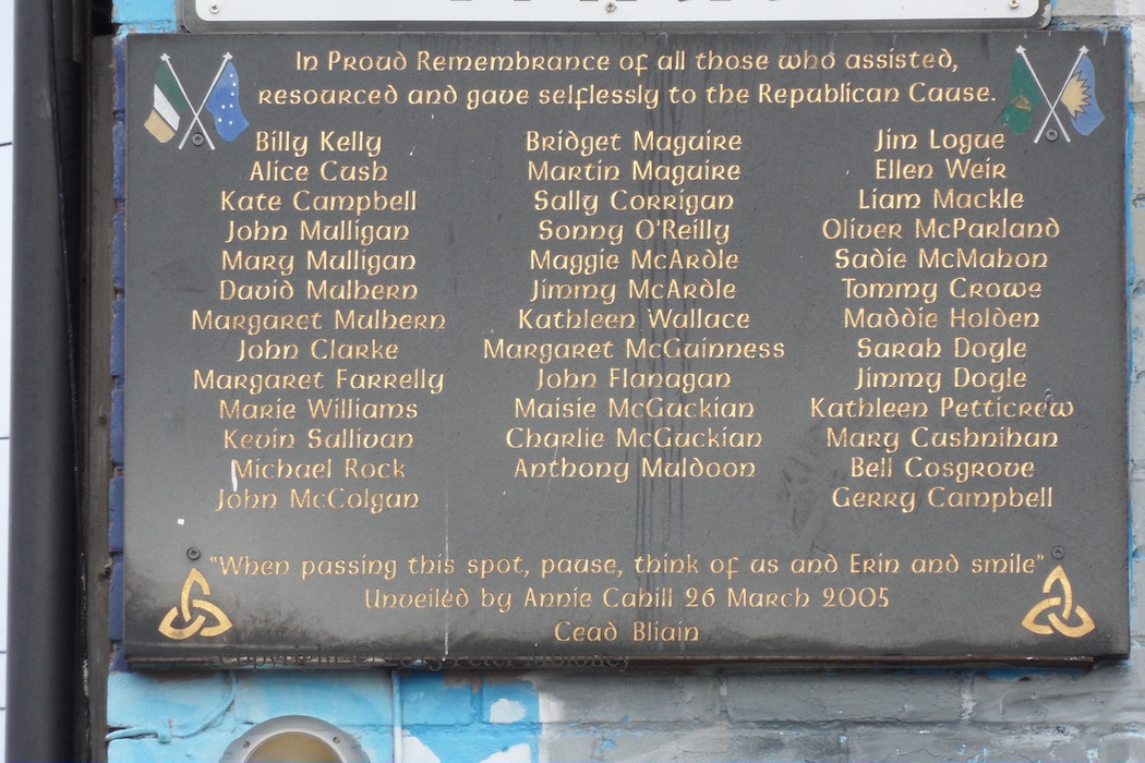The plaque on the left names others in addition “who assisted, resourced and gave selflessly to the republican cause”: Billy Kelly, Alice Cush, Kate Campbell, John Mulligan, Mary Mulligan, David Mulhern, Margaret Mulhern, John Clarke, Margaret Farrelly, Marie Williams, Kevin Sullivan, Michael Rock, John McColgan, Bridget Maguire, Martin Maguire, Sally Corrigan, Sonny O’Reilly, Maggie McArdle, Jimmy McArdle, Kathleen Wallace, Maragret McGuinness, John Flanagan, Maisie McGuckian, Charlie McGuckian, Anthony Muldoon, Jim Logue, Ellen Weir, Liam Mackie, Oliver McParland, Sadie McMahon, Tommy Crowe, Maddie Holden, Sarah Doyle, Jimmy Doyle, Kathleen Pettigrew, Mary Cushnihan, Bell Cosgrove, Gerry Campbell.