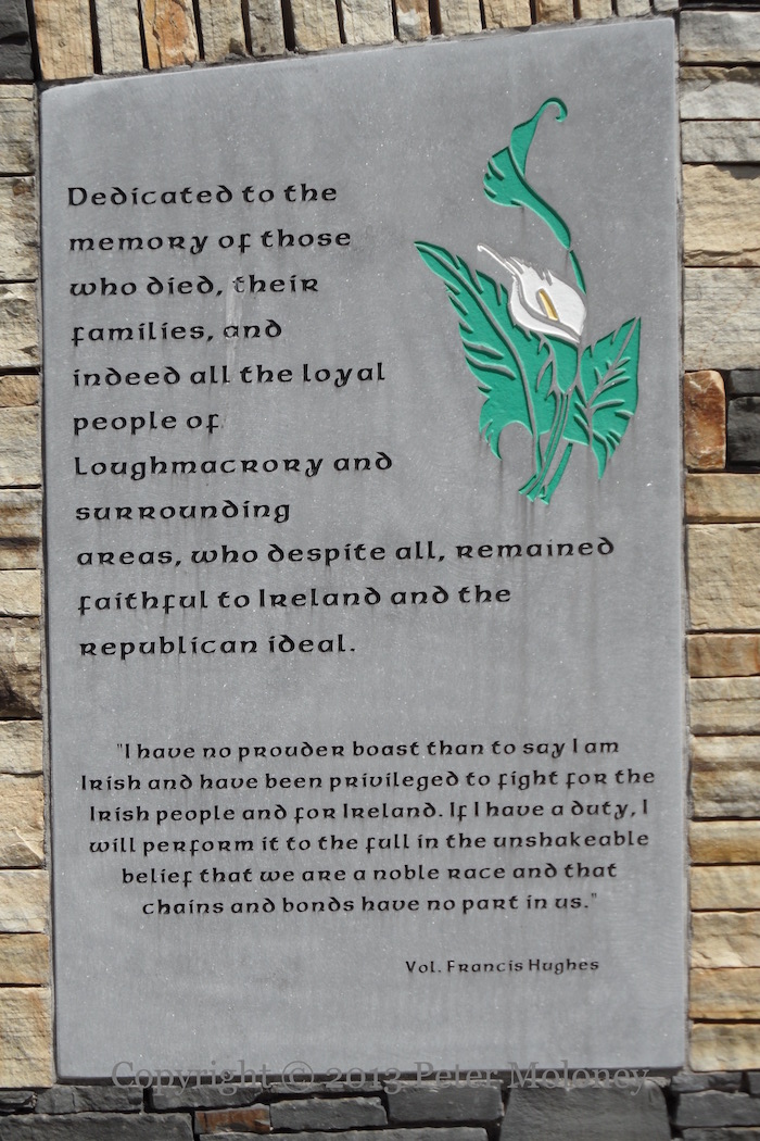“Dedicated to the memory of those who died, their families, and indeed all the loyal people of Loughmacrory and surrounding areas, who despite all, remained faithful to Ireland and the republican ideal. ‘I have no prouder boast than to say I am Irish and have been privileged to fight for the Irish people and for Ireland. If I have a duty, I will perform it to the full in the unshakeable belief that we are a noble race and that chains and bonds have no part in us.’ Vol. Francis Hughes.”