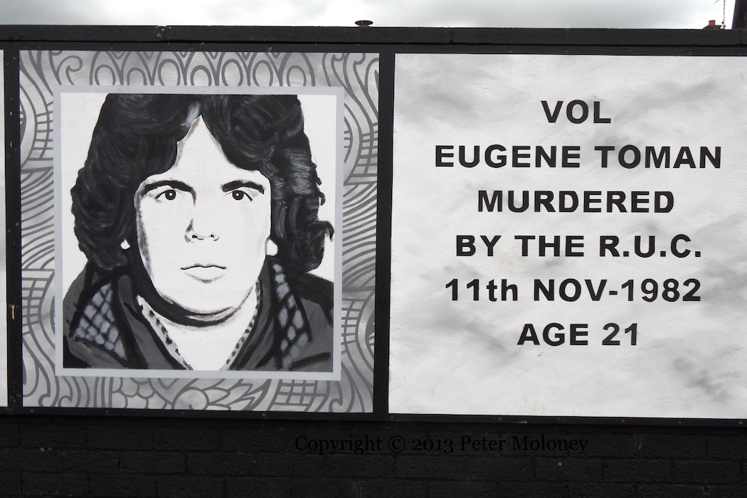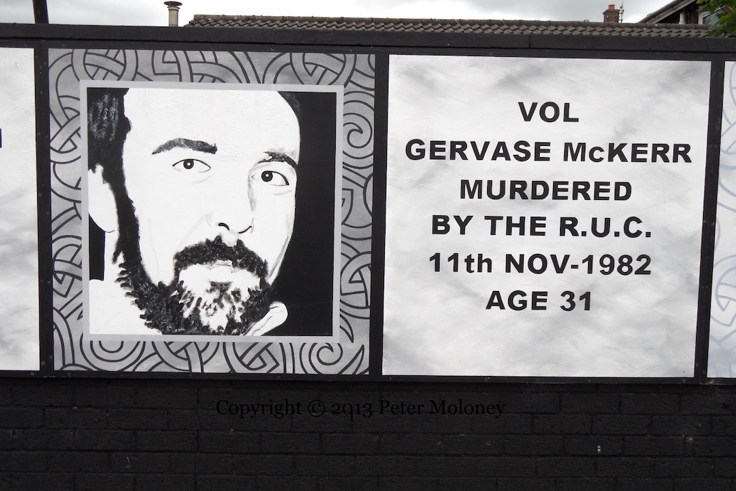 On the evening of November 21, 1982, the car in which IRA volunteers Eugene Toman, Sean Burns, and Gervaise [also spelled “Gervase” and “Gervais”] McKerr were travelling was hit by 109 bullets and all three were killed. They were perhaps the first victims of the “shoot to kill” policy. The first of the five panels in this Kilwilkie mural shows the bullet-holes in the driver’s side of the car, pointing out an inconsistency with the RUC’s statement that the car had run an RUC checkpoint and was fired at only from behind. (An Phoblacht)