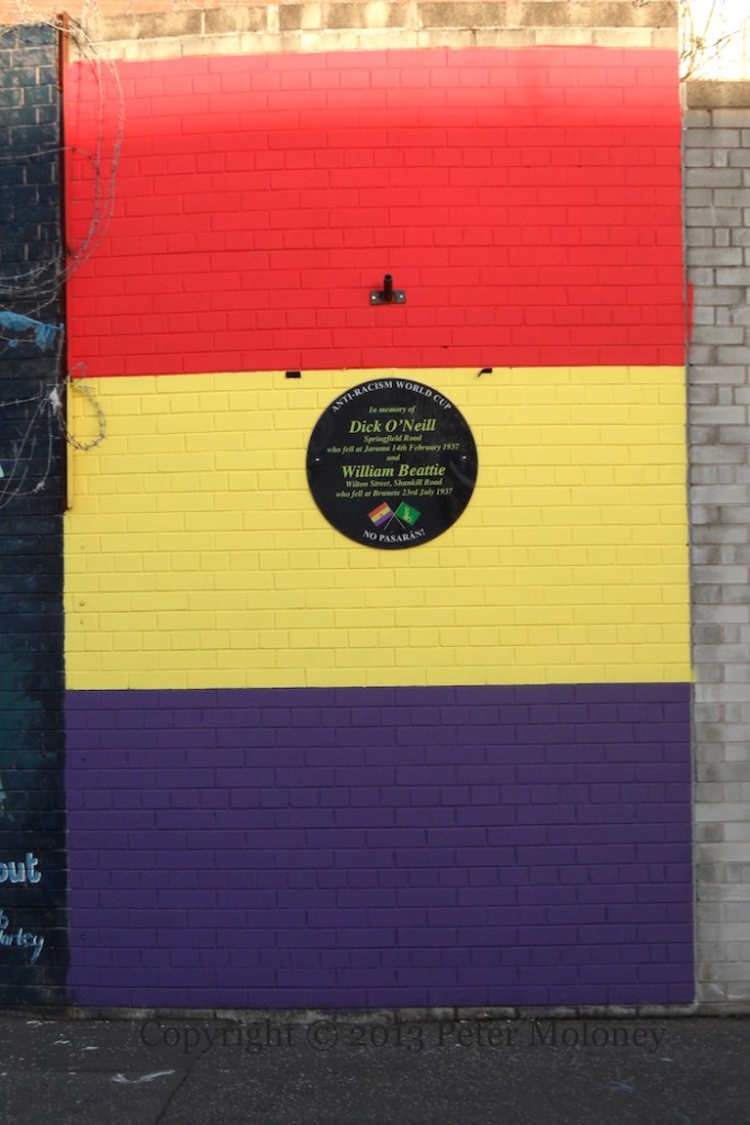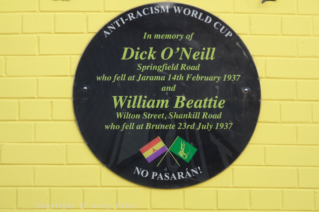 “Anti-Racism World Cup. In memory of Dick O’Neill, Springfield Road, who fell [in the Spanish Civil War] at Jarama 14th February 1937, and, William Beattie, Wilton Street, Shankill Road, who fell at Brunete 23rd July 1937. No Pasarán!” Both towns are near Madrid. The flags are those of the International Brigade and the Irish Citizen Army.