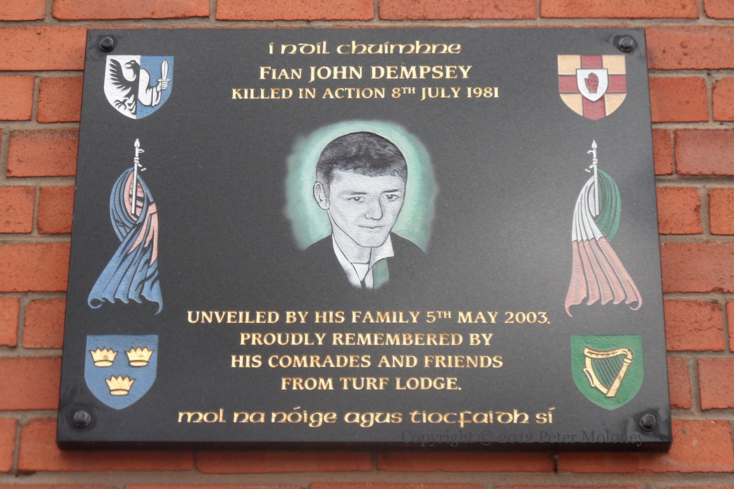 “I ndıl chuımhne Fıan John Dempsey killed in action 8th July 1981. Unveiled by his family 5th May 2003. Proudly remembered by his comrades and friends from Turf Lodge. Mol na nóıge [mol an óige] agus tıocfaıdh sí.” The sixteen-year-old Dempsey was shot by a British Army sniper during an attack on the Falls bus depot. Gerry Adams wrote a memorial in An Phoblacht.