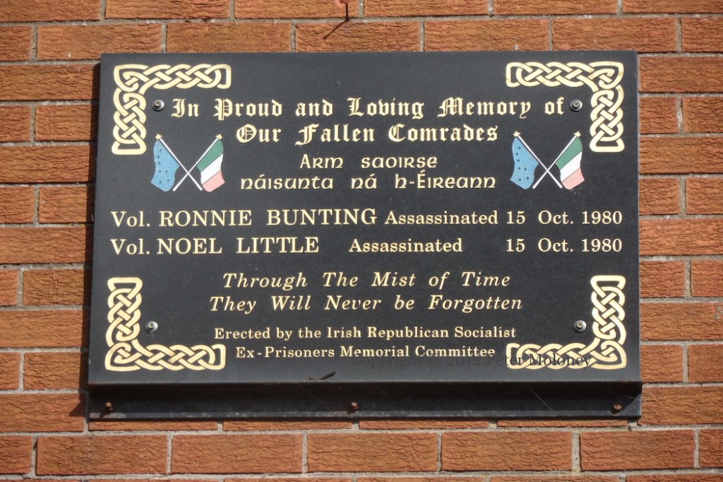 “In proud and loving memory of our fallen comrades. Arm saoirse náısunta [náısıúnta] ná hÉıreann. Vol Ronnie Bunting, assassinated 15 Oct. 1980, Vol Noel Little, assassinated 15 Oct. 1980. Through the mist of time they will never be forgotten. Erected by the Irish Republican Socialist Ex-Prisoners Memorial Committee.” Bunting and Little of the INLA were shot and killed at Bunting’s Downfine Gardens home by the UDA. Bunting’s wife was shot in the face but survived. (WP)