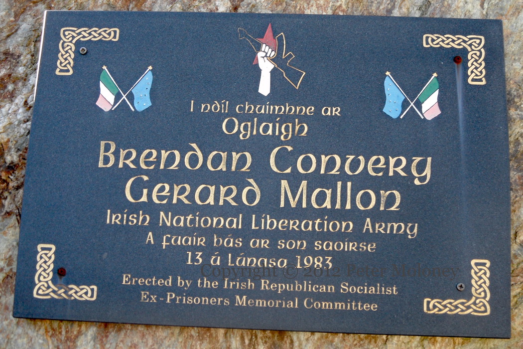 “I ndıl chuımhne ar óglaıgh Brendan Convery [agus] Gerard Mallon, Irish National Liberation Army, a fuaır bás ar son saoırse 13ú Lúnasa 1983. Erected by the Irish Republican Socialist Ex-Prisoners Memorial Committee.” The pair were shot during an attack on an RUC checkpoint in Dungannon (Sutton | IRSP).