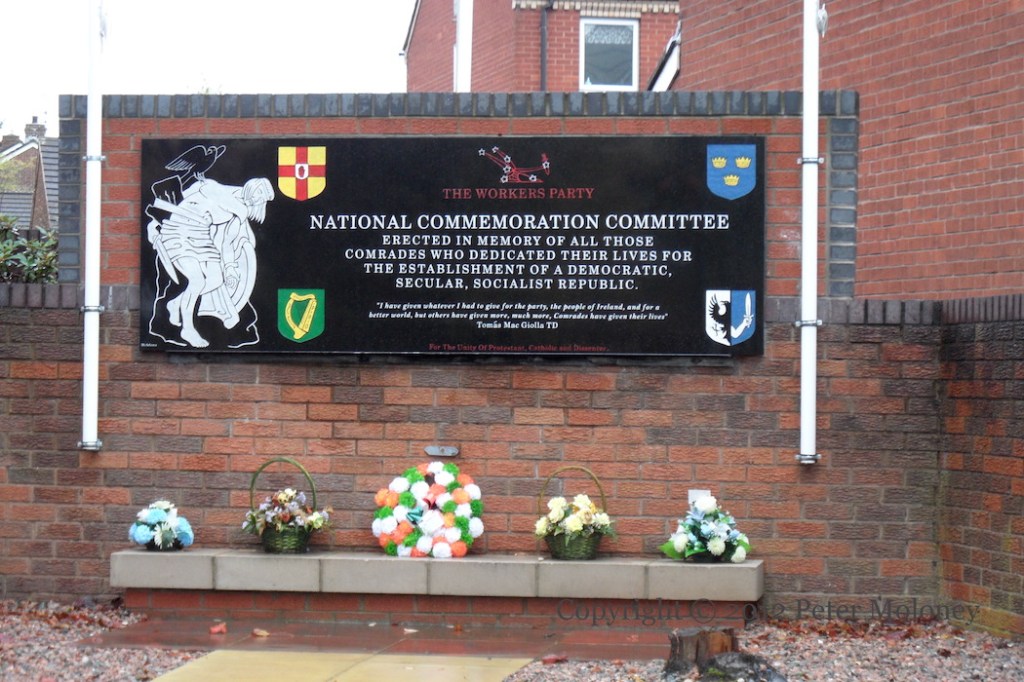 “The Workers Party National Commemoration Committee. Erected in memory of all those comrades who dedicated their lives for establishment of a democratic, secular, socialist, republic. ‘I have given whatever I had to give for the party, for the people of Ireland, and for a better world, but others have given more, much more. Comrades have given their lives.’ – Tomás Mac Gıolla TD. For the unity of Protestant, Catholic and Dissenter.”