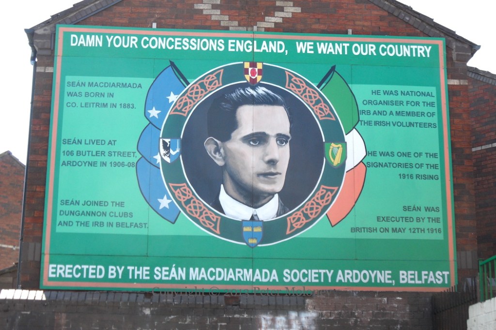 “Damn your concessions England, we want our country.” Board to Seán Mac Dıarmada in Ardoyne, detailing his exploits leading up to and including the 1916 uprising and his earlier connection with the local area. “Seán lived at 106 Butler Street, Ardoyne in 1906-08.”