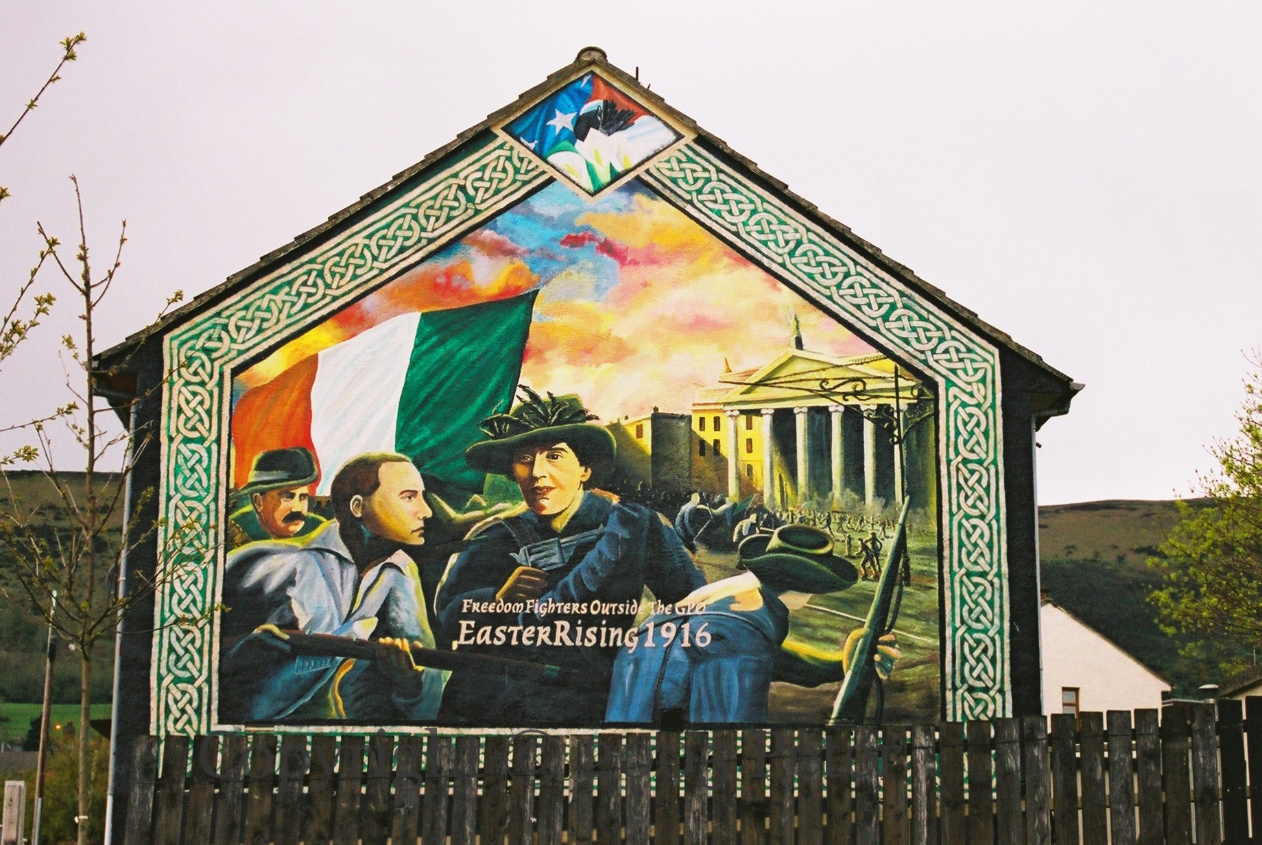 “This mural is dedicated to the memory of those local republican activists [34 portraits of volunteers from “A, D, F foıreannacha, cathlann 3rú, Brıogáıd mBéal Feırste”] who devoted their lives to the cause of Irish freedom. Ar son na c[ú]ıse. Óglaıgh na hÉıreann. Unveiled by Sınn Féın councillors Martin Meehan and Margaret McClenaghan.”