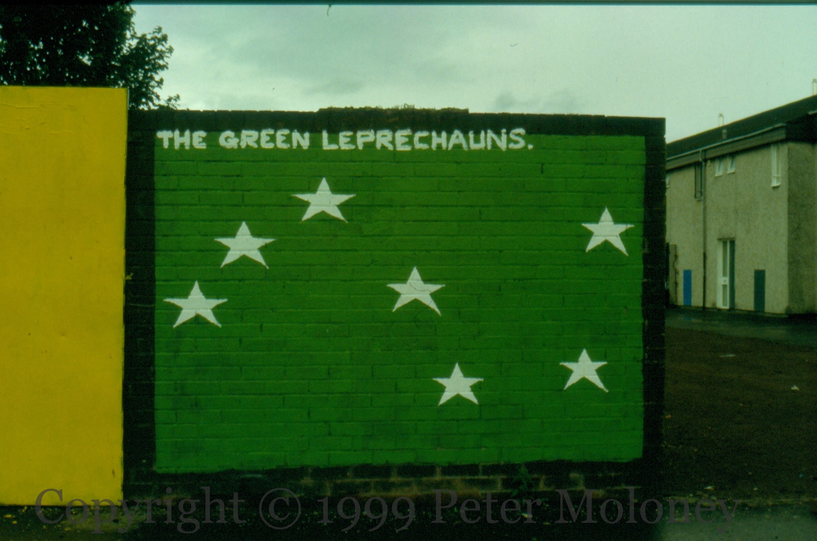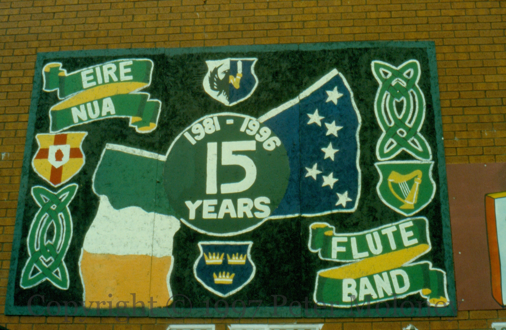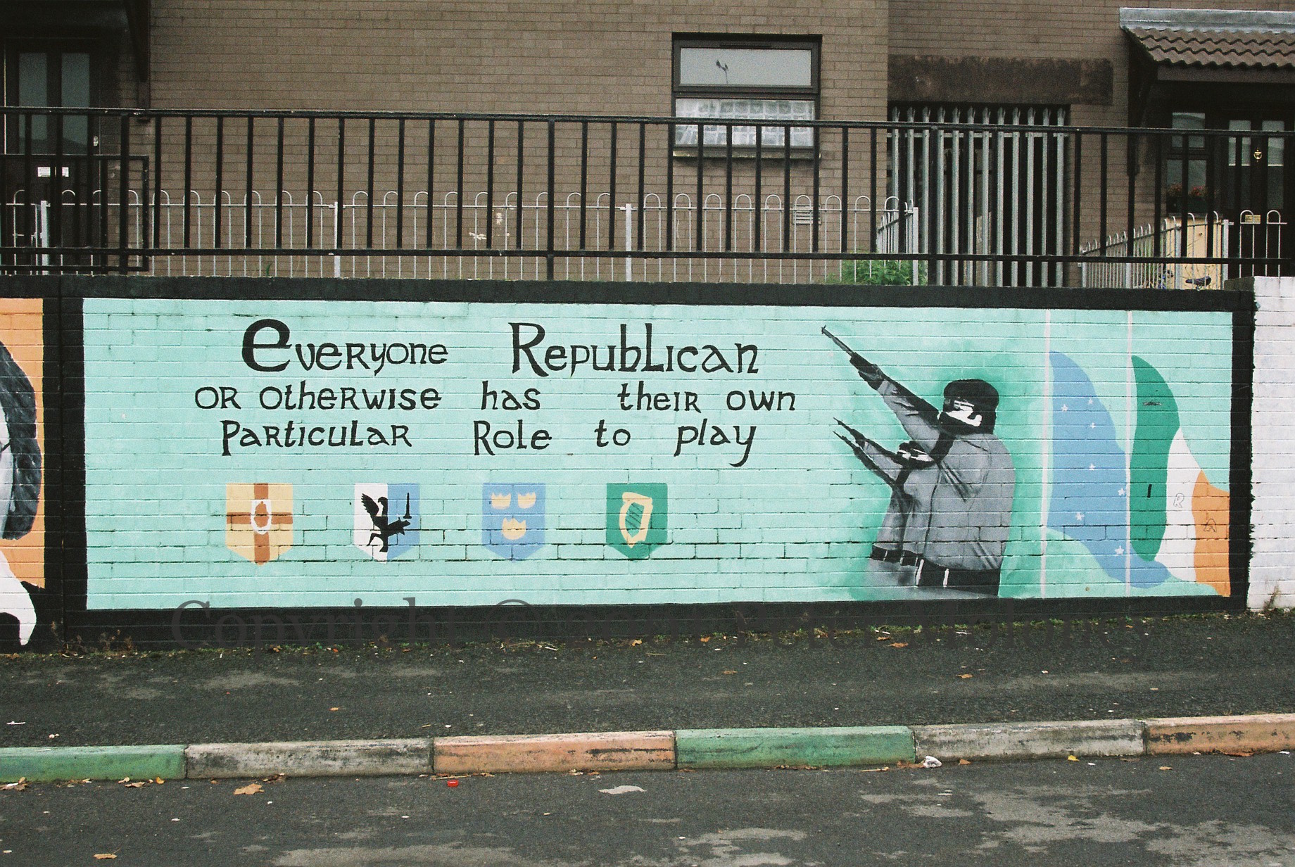 A large “H” on the Whiterock Road, Belfast with pictures of the ten deceased 1981 hunger strikers, and Frank Stagg and Michael Gaughan on the crossbar, with Tricolour and Starry Plough flags (and perhaps a 20th anniversary flag).