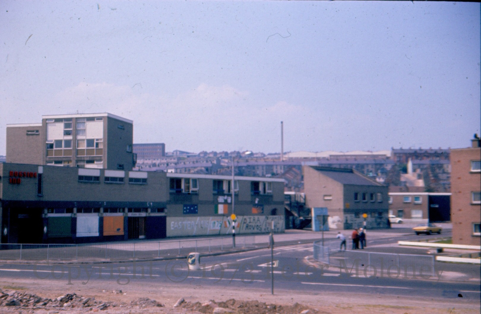 On the side of the Bogside Inn on Westland Street, Derry: “Easter 1916”, “1975” (suggesting that the date in the catalogue is wrong), “PIRA Provos”. The lower-level graffiti was painted out in 1981 – see Westland Street, 1981