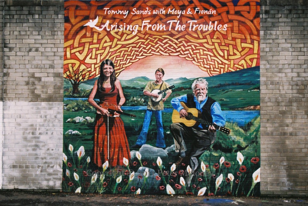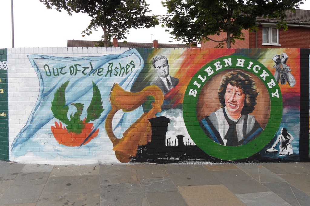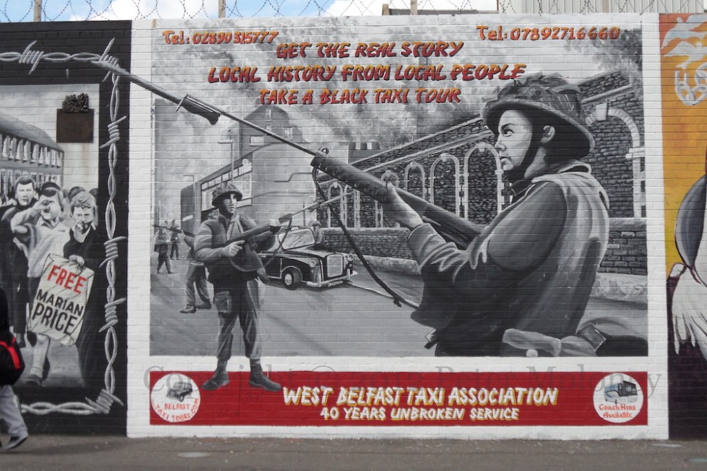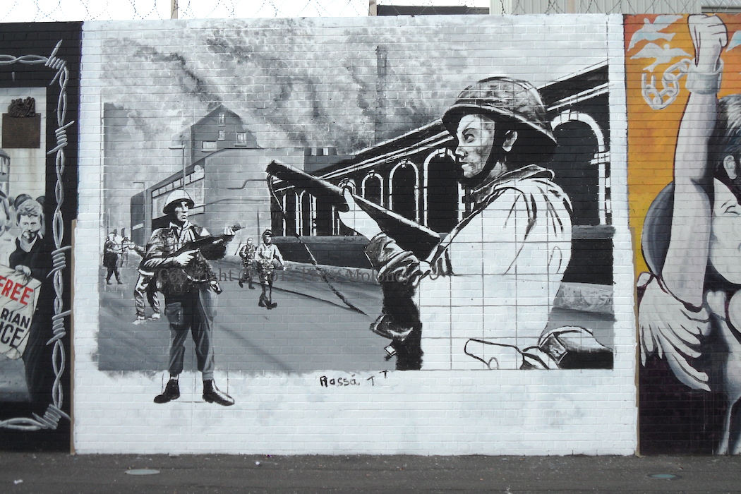 It is applied here to the 1912 Ulster Covenant being backed up by the 1914 gun-running. Edward Carson is shown acknowledging the cheers of the Ulster Volunteers, who have been drilling at Glencairn (as seen in this Shankill mural).