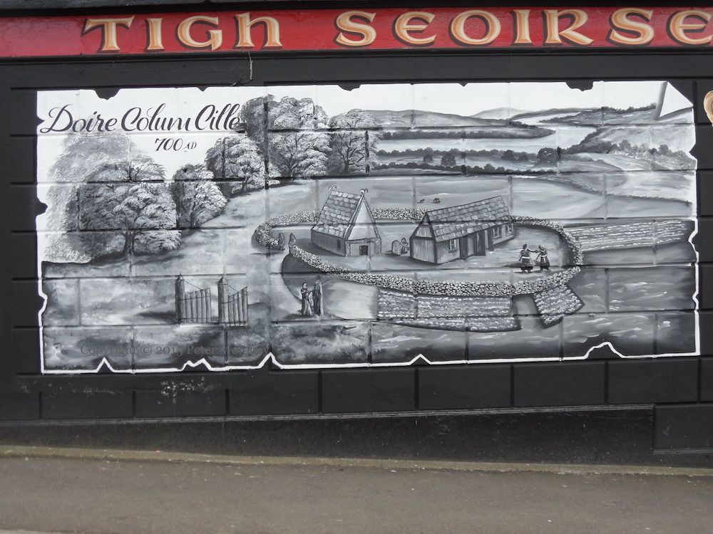 In the border, clockwise from left to right, we see: the Tandragee Idol (WP), Naomh Bríd/St Brigid’s, St Patrick preaching the trinity, Irish dancing, Gaelic football, Armagh Harps, “Ard Mhacha”, the Armagh county crest in colour in the apex (Club & County), “Armagh”, Na Pıarsaıgh Óga, hurling/camogie, Cú Chulaınn’s, mummers (perhaps specifically the Armagh Rhymers), Jonathan Swift, a steam locomotive (perhaps representing the Armagh rail disaster of 1889, in which 80 people died WP); a vintage image of Callan Street is depicted along the bottom (History Armagh).