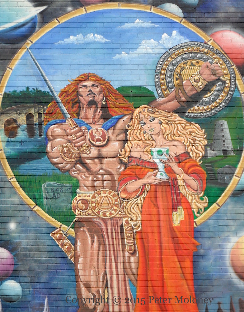 This is a mural of King Niall (Nıall Caılle, Niall of the Callan) and Queen Macha. Niall was high king of Ireland (in competition with Fedelmıd of Munster WP) who held off the Vikings in the late 800s (WP) and died in 846 by drowning in the Callan river. Macha is a much earlier and mythological queen, and gives her name to the town: Ard Mhacha.