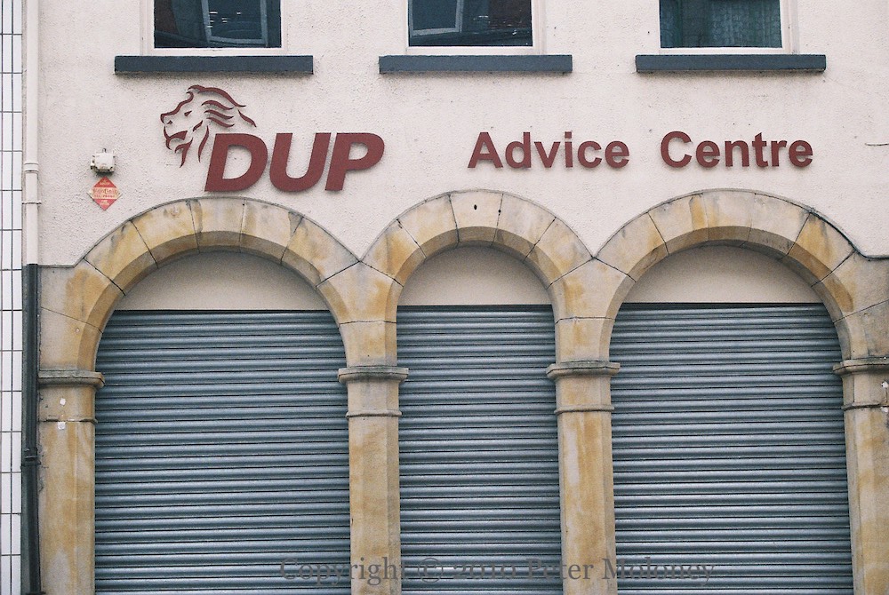 Rival constituency offices on opposite sides of Market Square in Dromore. Above, the UUP office (Basil McCrea MLA); below, the DUP office (MLAs Jonathan Craig, Jeffrey Donaldson, Edwin Poots). With commentary on a nearby wall: “DUP sell out”.