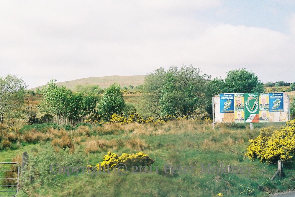 Sınn Féın “leadership/ceannasaíocht” electoral posters (O’Neill, McGuinness, Molloy, Milne) on either side of Maid Of Erin harp, Glenshane Pass, outside Derry.