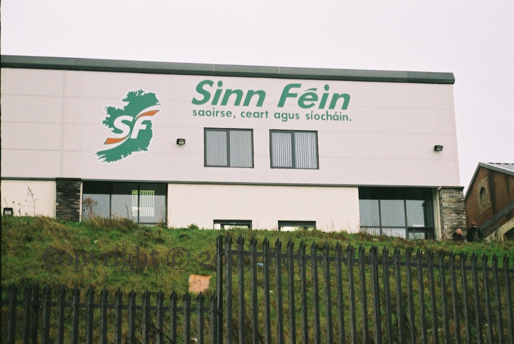 Four Sınn Féın offices (or co-opted buildings as in the first image), in Crossmaglen, Armagh, Coalisland (including an IRA Tyrone Brigade plaque), and Derry.