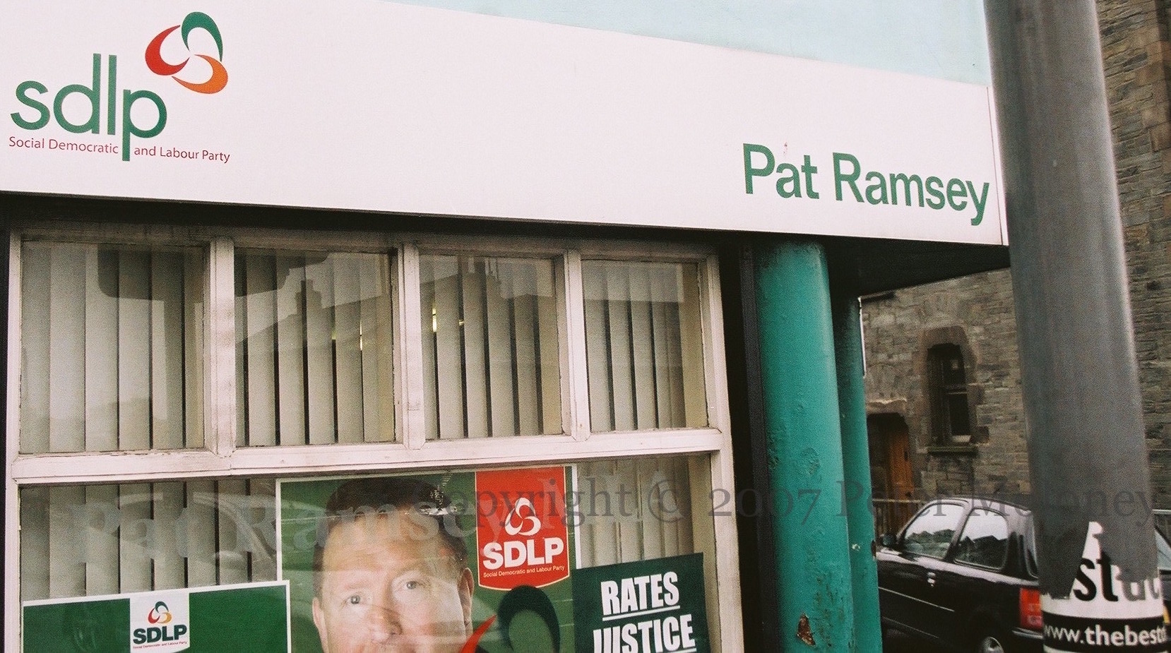 Two images related to the SDLP in Derry: party leader Mark Durkan became MP for Foyle in 2005, while Pat Ramsey was mayor of Derry in 1999-2000 and MLA for Foyle from 2003 onward. Both are from Derry. Ramsey’s offices are in Creggan Road; the Durkan hoarding is in ?William Street?