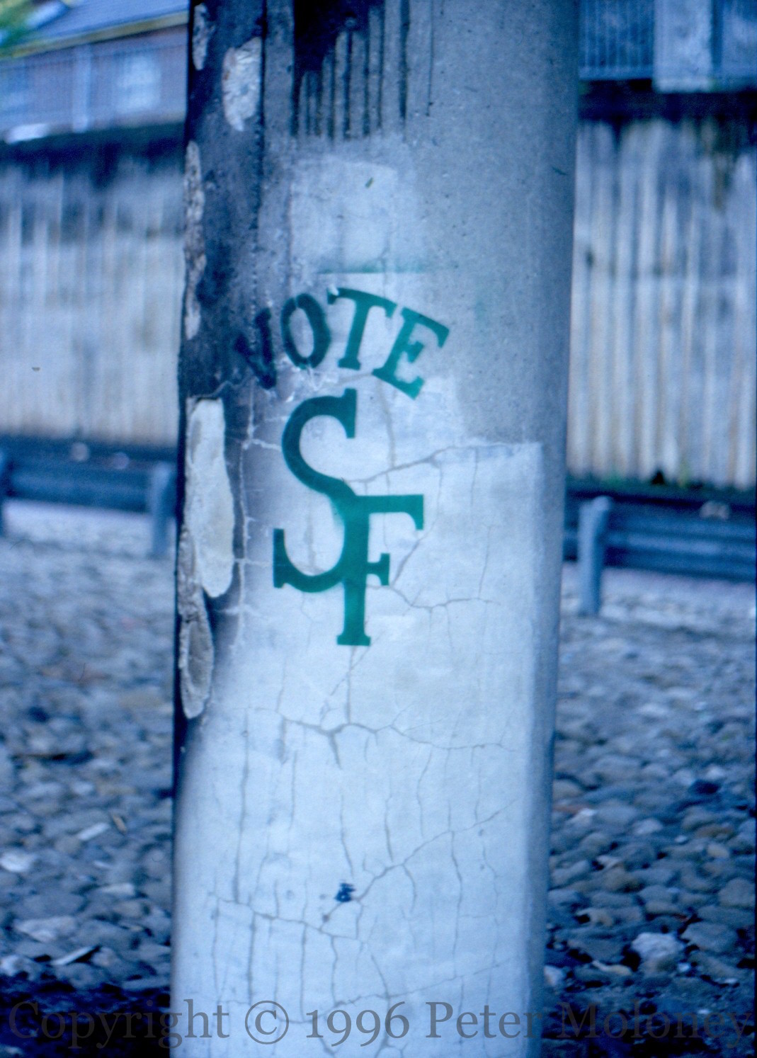Graffiti on the side of the Falls library, perhaps relating to the May 30th, 1996 Forum elections.