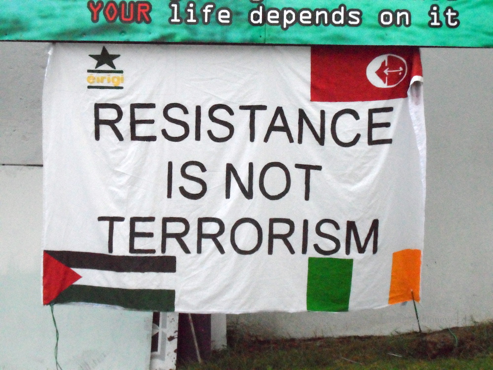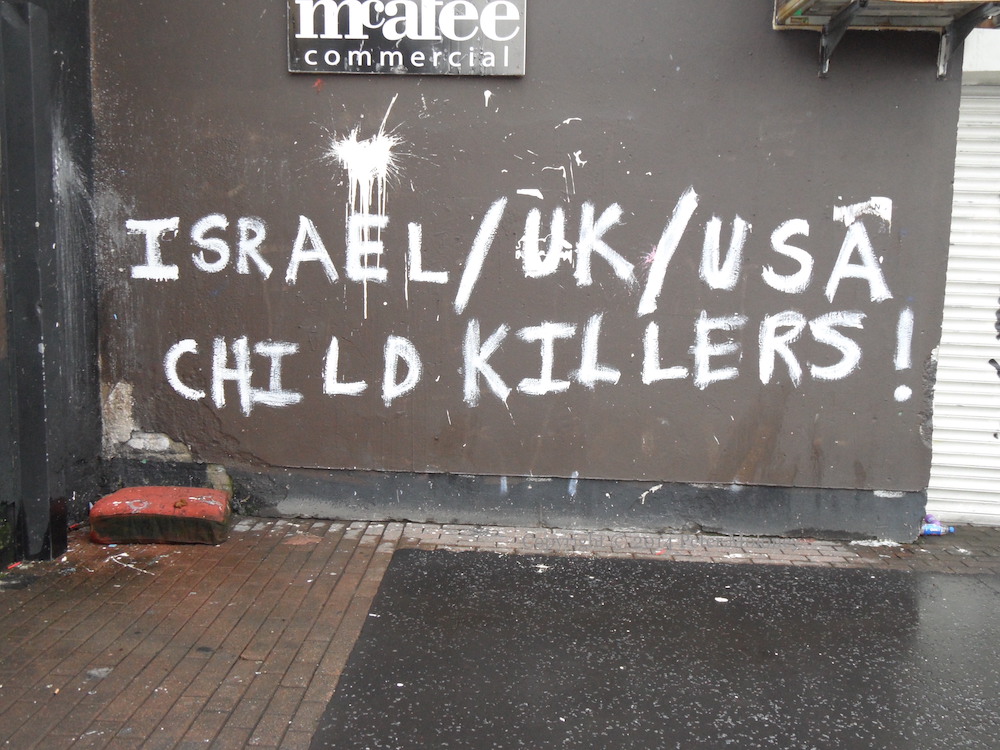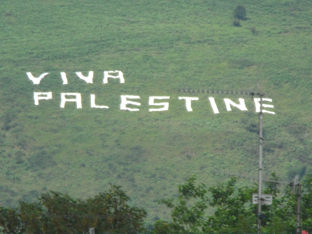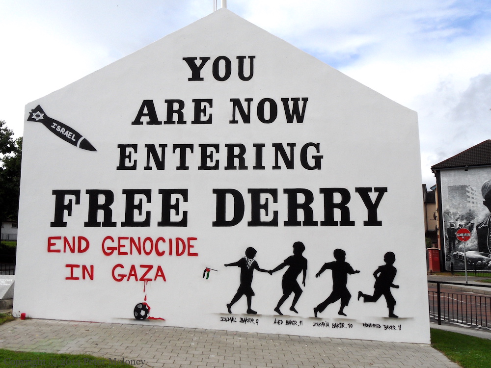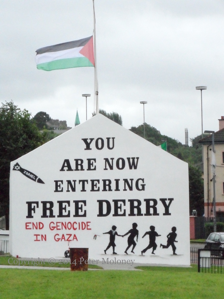 “Ireland Palestine Solidarity Campaign [web] – IPSC Belfast/Béal Feırste” – this tarp is on the railings at St. Mary’s (teacher training college), Falls Road. The groups held a rally in July demanding a stop to the slaughter.