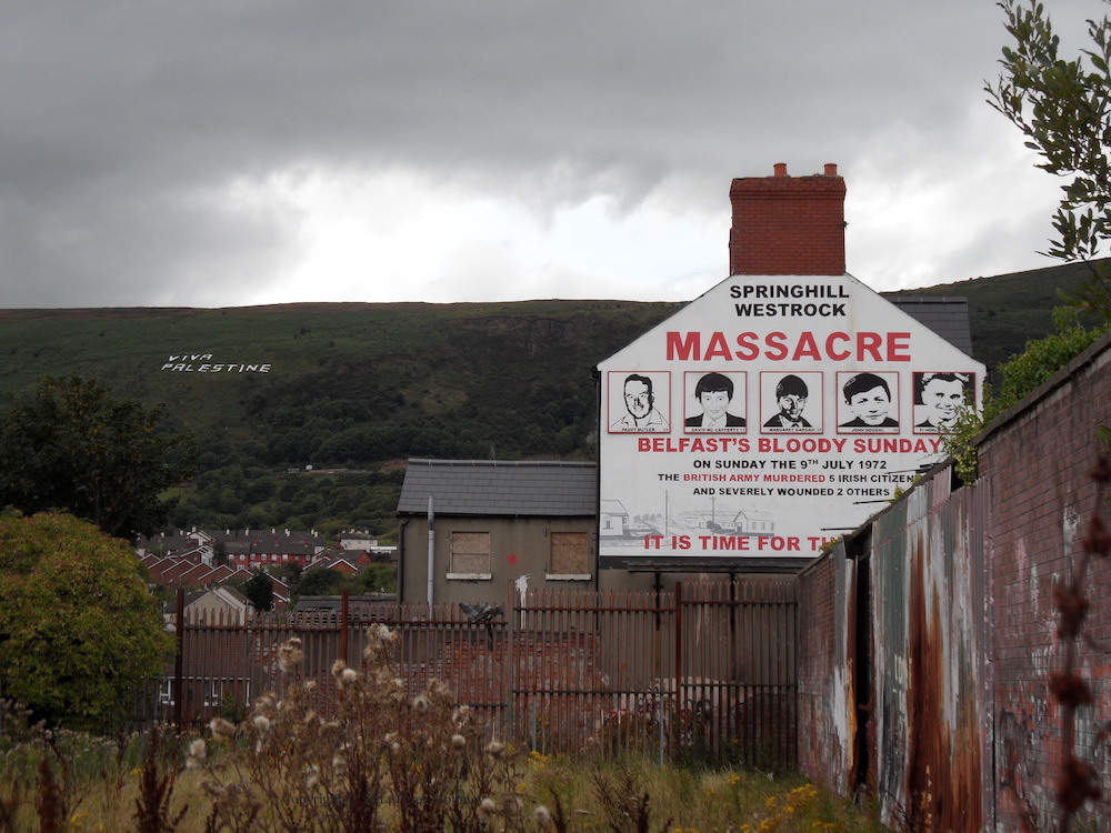 “Oppression breeds resistance”, in the form of Leila Khaled and an IRA gunman, and a clenched fist in the colours of the Palestinian flag. This is a new pro-Gaza mural in the middle Falls with Irish “Tıocfaıdh ár lá” [our day will come] and Arabic “يومنا قادم” [our day is coming] (and in the shields “Saoırse” and “حرية”[freedom]).