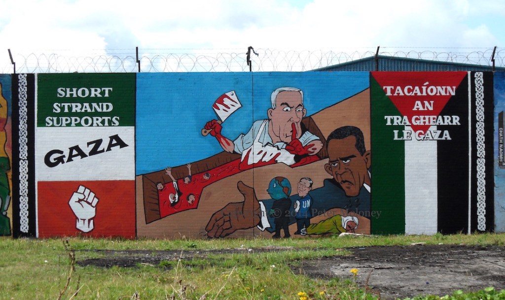 “Short Strand supports Gaza – tacaíonn An Trá Ghearr le Gaza”. The centre of this mural is Carlos Latuff’s cartoon Do Not Disturb – War Criminals Working. Israel, in the form of an aproned Benjamin Netanyahu, is butchering the people of Gaza. The world watches with some concern, Ban Ki-Moon and the UN look away, and the Arab League is asleep. The United States, in the form of Barack Obama, prevents any intervention.
