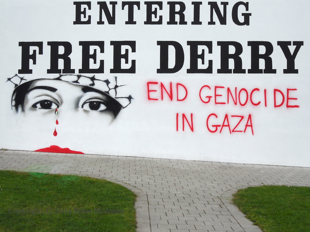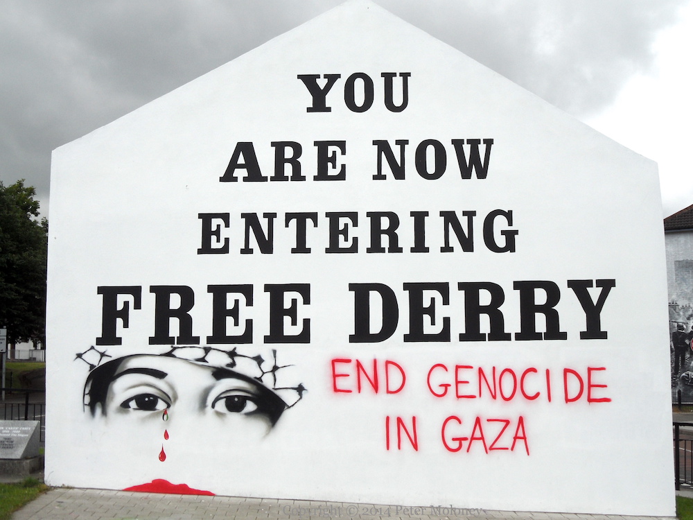 The mural is on the International Wall, Divis Street, west Belfast, as are the pavement stencils. “Free Gaza” is on Northumberland Street.