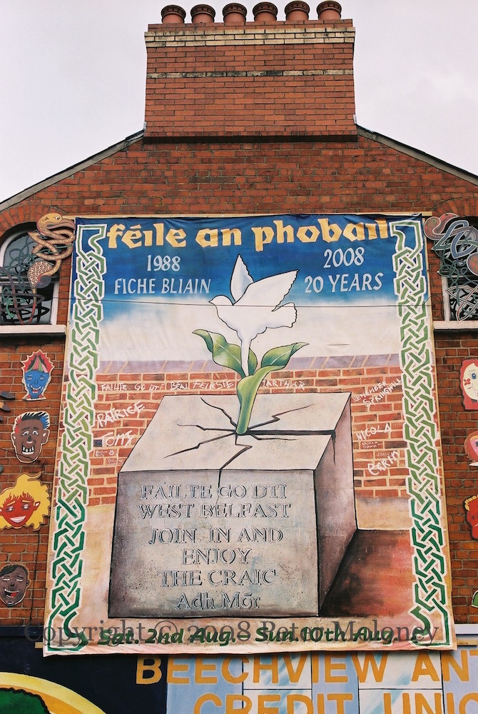 “Féıle An Phobaıl, 1988-2008 fıche blıaın/20 years. Fáılte go dtí West Belfast. Join in and enjoy the craic. Adh mór [good luck] Sat 2nd Aug – Sun 10th Aug”. A Robert Ballagh illustration of a dove-shaped lily emerging from a border bollard, done originally for Féıle in 1993. Rockdale Street, Belfast.