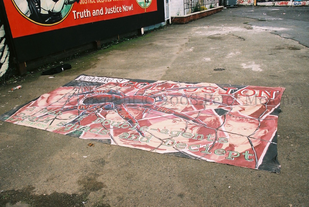 It’s not clear that this ‘collusion’ tarp – with spider-legs of MI5, UDR, PSNI, RHC, UFF, LVF, UDA, UVF and a web beginning at the door of 10 Downing Street – was ever hung, perhaps due to the spelling mistake: “A web of double-agents, death squads and deciept [sic]”. Similar image on Andersonstown Road. It is lying at the Glen Road-Falls Road junction, site of the old RUC barracks.