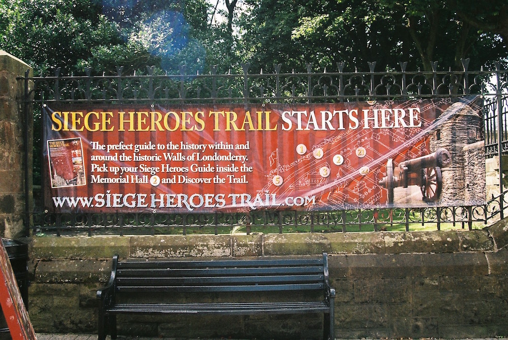 “Siege heroes trail starts here [i.e. the junction of Palace and Society streets]. The perfect guide to the history within and around the historic Walls of Londonderry. Pick up your Siege Heroes Guide inside the Memorial Hall and Discover the Trail. http://www.siegeheroestrail.com”