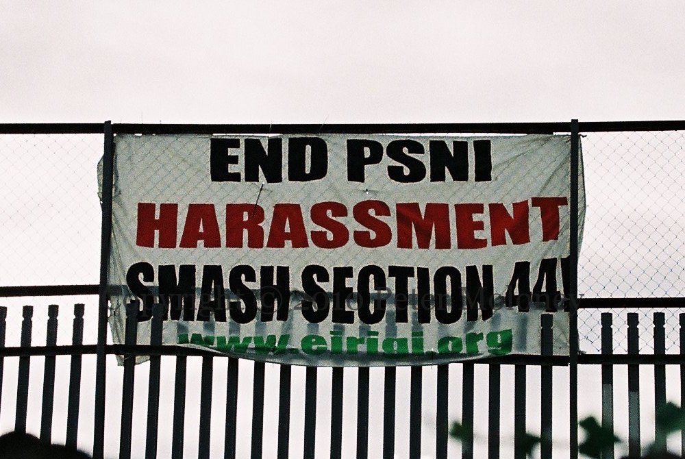 “End PSNI harassment – smash section 44!” ‘Section 44’ is a reference to the Terrorism Act of 2000, which allows police to stop and search people without “reasonable suspicion”.
