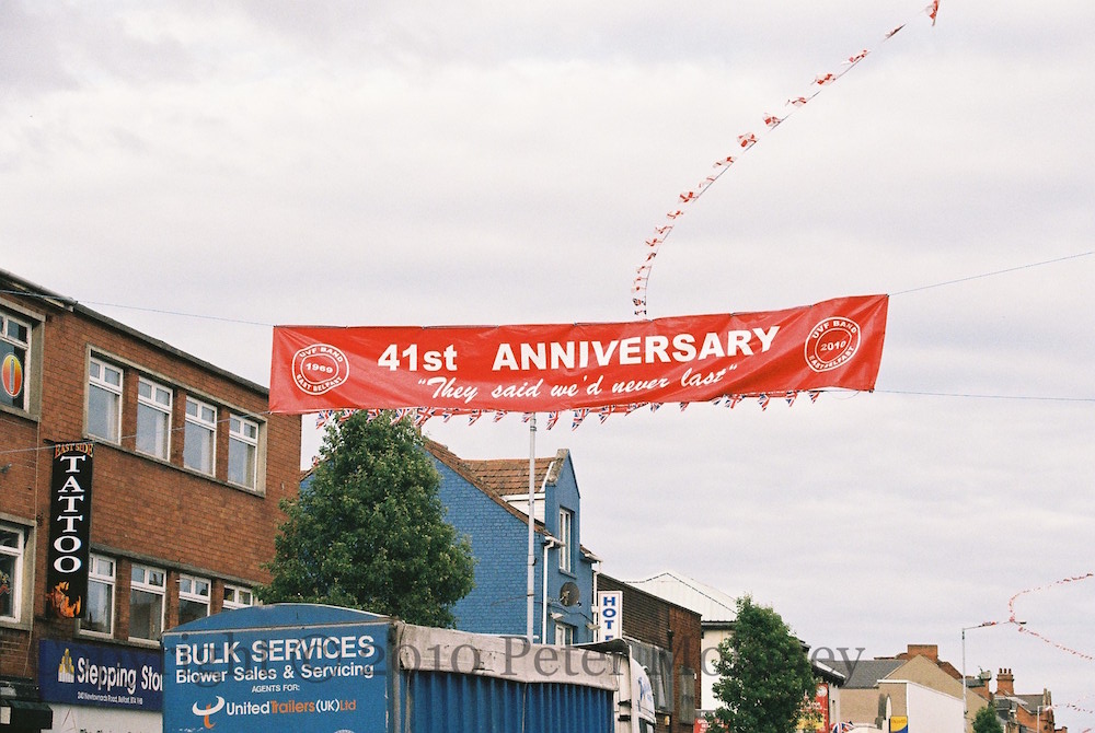 The UVF flute band celebrates its 41st anniversary with a banner over Newtownards Road, Belfast. There was one in 2009 for the 40th. “They said we’d never last.”